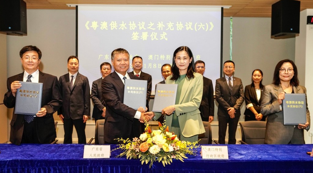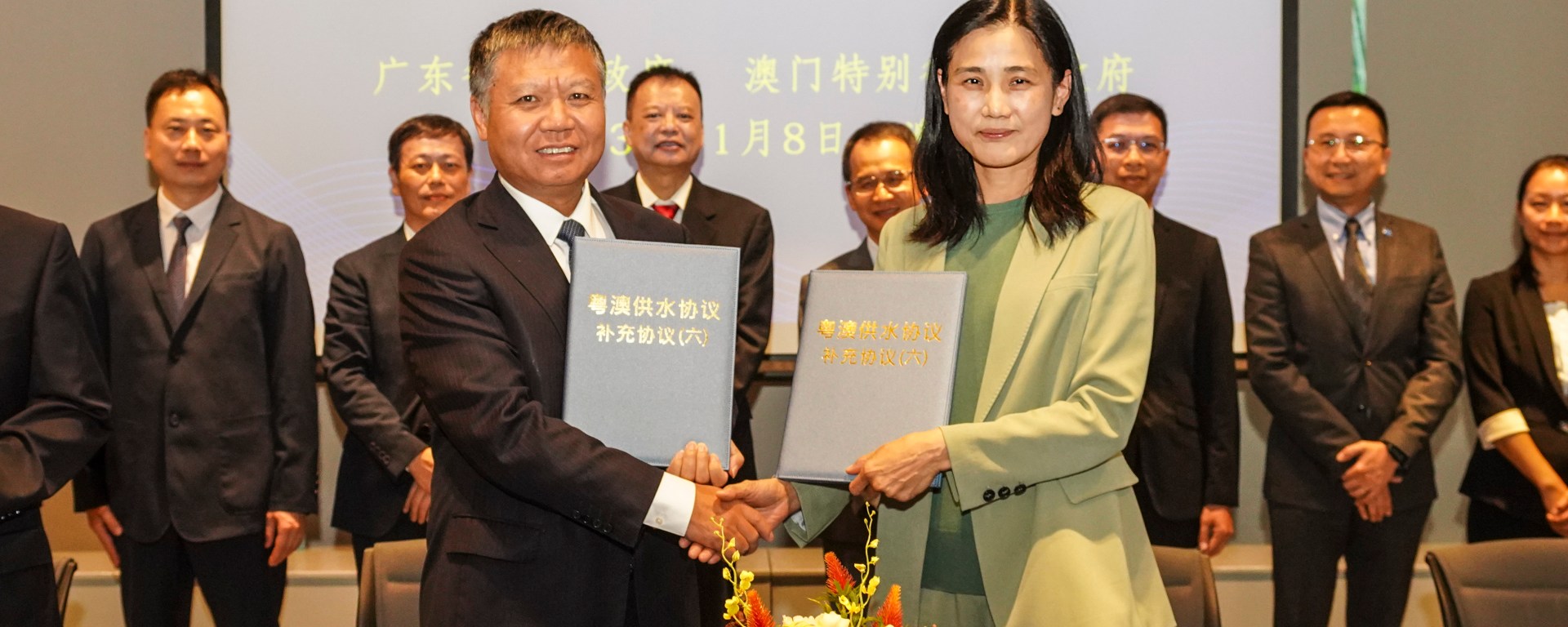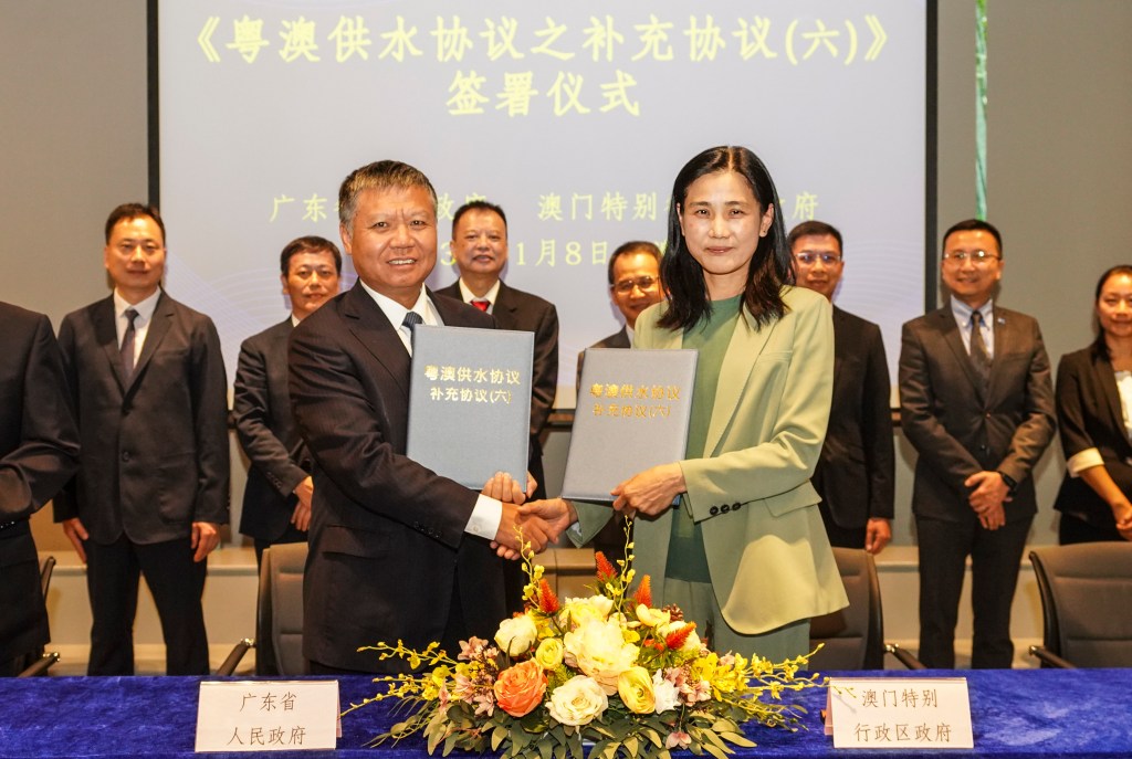 粵澳雙方代表日前於澳門海事及水務局大樓簽署《粵澳供水協議之補充協議(六)》,廣東省人民政府代表廣東省水利廳廳長王立新、澳門特別行政區政府代表海事及水務局局長黃穗文、珠海經濟特區對澳門供水有限公司董事長李永海和澳門自來水股份有限公司執行董事關小冰出席儀式並簽署補充協議。