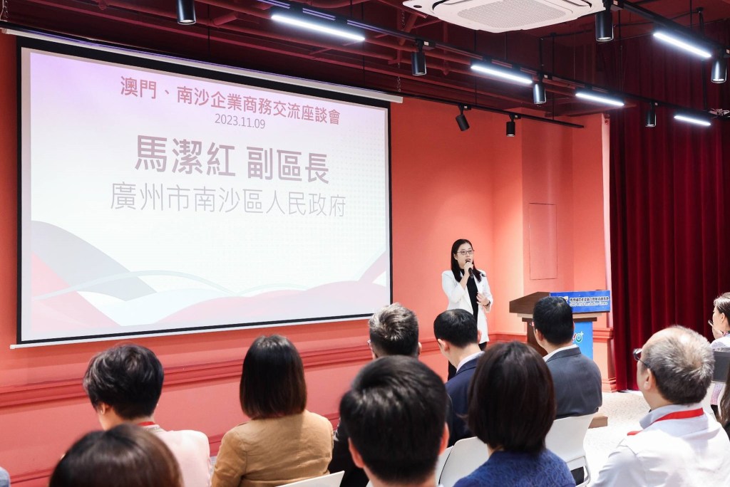 會上,廣州市南沙區人民政府副區長馬潔紅介紹當地營商政策及投資環境,澳門及南沙企業代表亦分享落戶南沙和在地營商經驗。會後代表團與廣州及南沙企業進行交流,探尋合作機會。