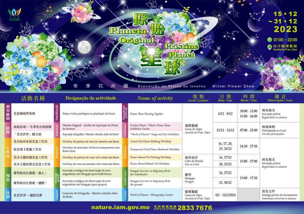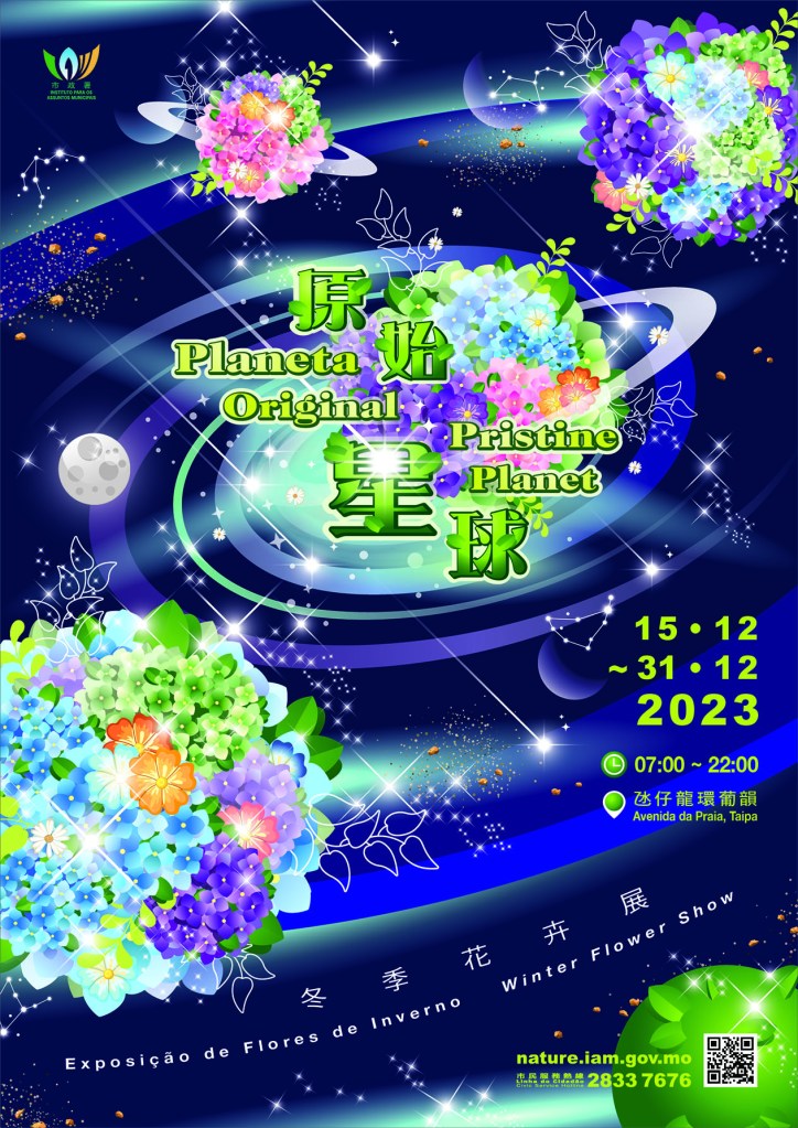 為慶祝澳門特別行政區回歸祖國,豐富市民餘閒活動及增加特色旅遊資源,市政署將於十二月十五日至三十一日舉辦「2023年冬季花卉展」,並以「原始星球」為題材,在主展場龍環葡韻以球狀花卉作主題佈置,引領市民和旅客在模擬的原始和星球環境中來回穿梭,開展別具韻味的探索之旅。