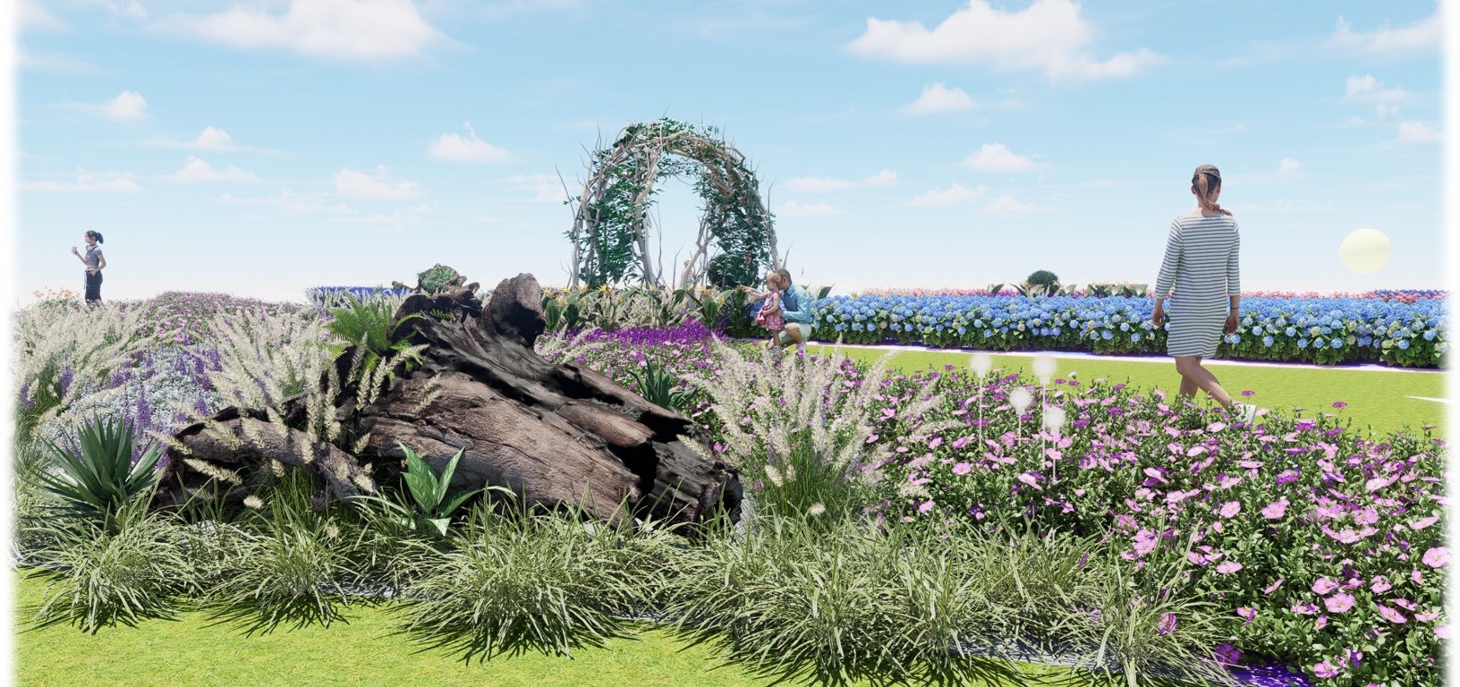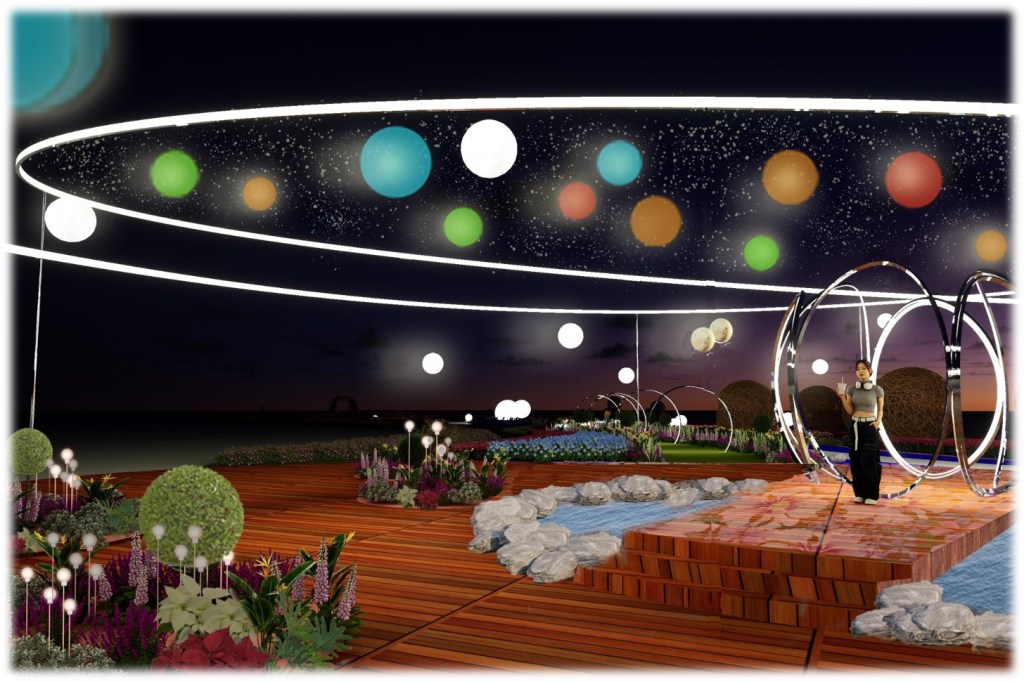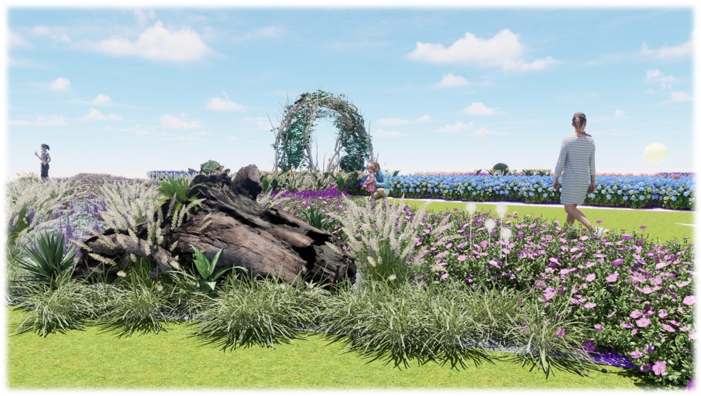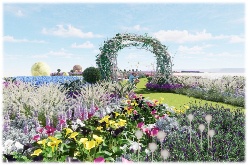 本年冬季花卉展將呈現多種球狀花卉,如繡球花、乒乓菊、大麗花等,形態鮮明、顏色多樣。主展場分為原始區和星球區兩個區域。探索者由「圓」開始,先進入川流不息的「原」始七彩花田,兩旁有巨型樹幹及闊葉植物,經過枝條拱門,就會發現層次豐富的球狀植物組景。繼續向前行,當到達水池中央的星球,便打開另一個空間,再穿越一道又一道的圓形時光拱門,就來到神奇的星雲地帶,那裏的軌道環相互交織,上方飄浮著七彩氣球,四周則擠滿巨型球狀植物,而位於正中央的星球,仿佛會在進入後瞬間消失,令整個旅程充滿神秘感。