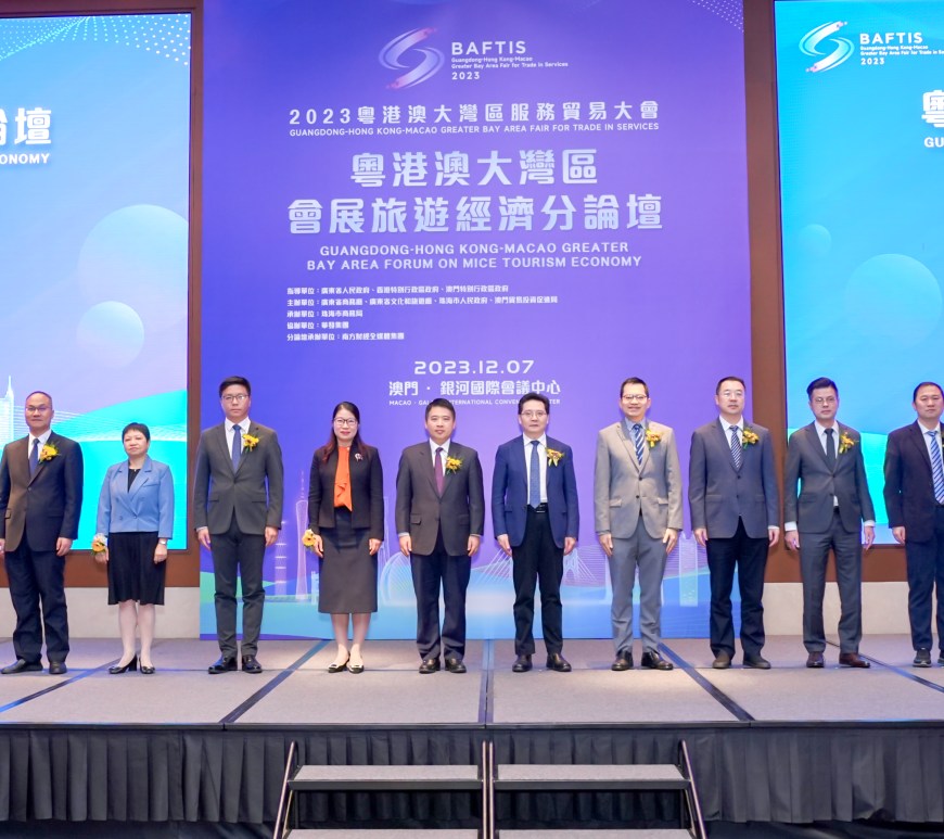 以「一會展三地」辦展新模式舉行的「2023粵港澳大灣區服務貿易大會」 在澳門的分會場-「粵港澳大灣區會展旅遊經濟分論壇」日前展開。廣東省商務廳廳長張勁松、珠海市市長黃志豪、澳門貿易投資促進局主席余雨生、廣東省文化和旅遊廳副廳長趙紅,以及近180位粵港澳會展行業菁英、專家、學者,參與,圍繞「重新鏈接,多元會旅」主題,展開3場主題演講和2場圓桌對話。