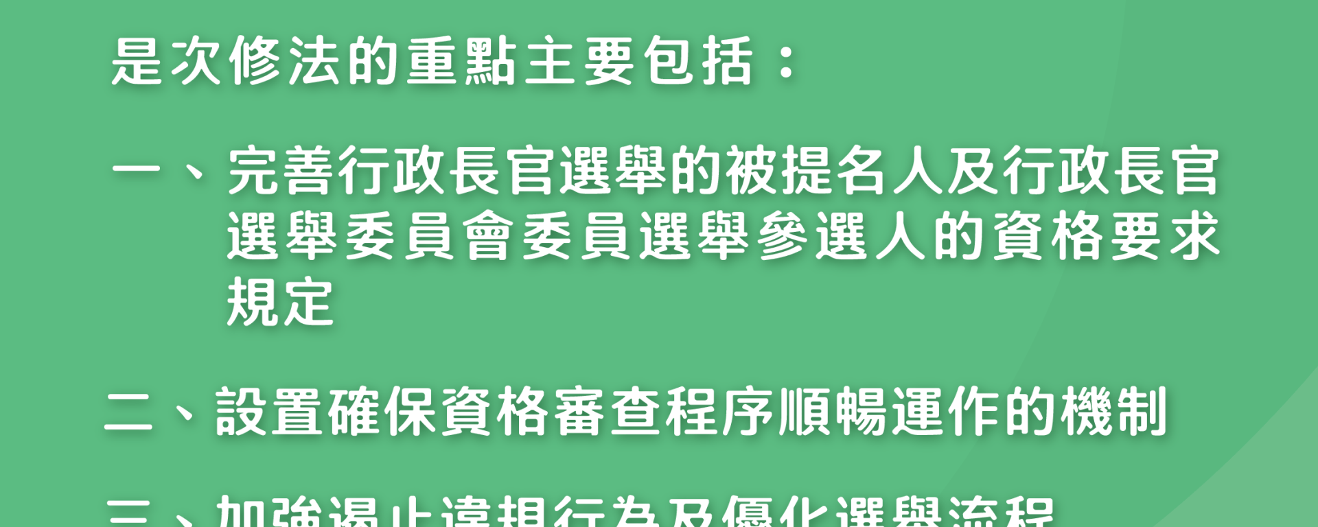 第20/2023號法律主要從三方面優化行政長官選舉的管理及流程,包括:完善行政長官選舉的被提名人及行政長官選舉委員會委員選舉參選人的資格要求規定;設置確保資格審查程序順暢運作的機制;加強遏止違規行為及優化選舉流程。