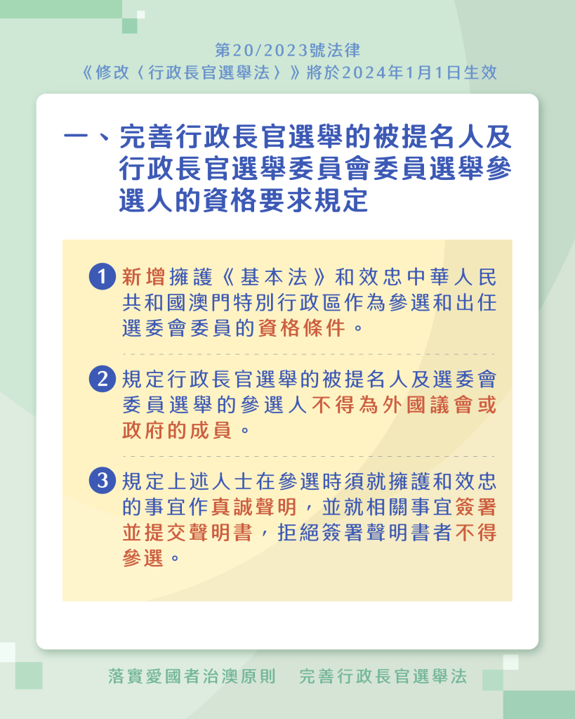第20/2023號法律《修改〈行政長官選舉法〉》於12月27日公佈,已於2024年1月1日生效,有關法律的生效標誌著澳門特區從法律制度和執行機制上進一步落實「愛國者治澳」原則。