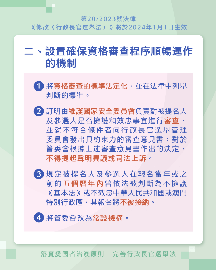 此外,法律設置確保資格審查程序順暢運作的機制,將資格審查的標準法定化,列舉相關判斷標準,訂明由維護國家安全委員會負責就被提名人及參選人是否擁護和效忠事宜進行審查,並就不符合條件者向行政長官選舉管理委員會發出具約束力的審查意見書;對於管委會根據上述審查意見書作出的決定,不得提起聲明異議或司法上訴。