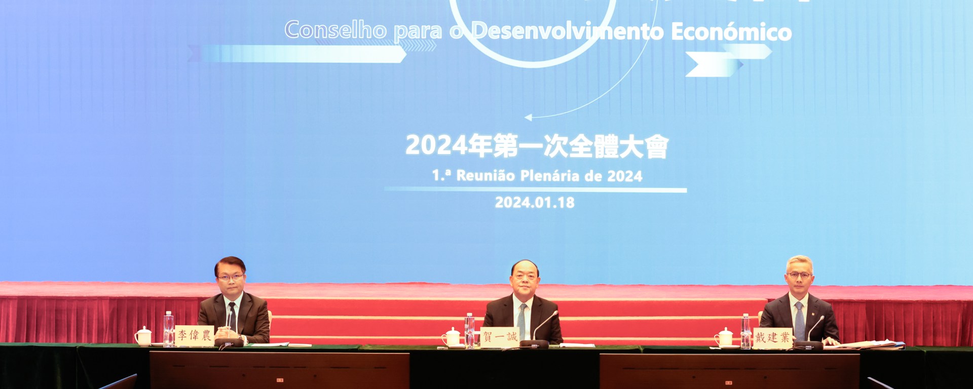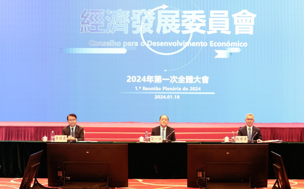 「經濟發展委員會2024年第一次全體大會」日前召開,大會由經濟發展委員會主席、行政長官賀一誠主持。會上經濟發展委員會副主席、經濟財政司司長李偉農介紹了目前澳門的經濟情況,多位委員對近日發佈的《橫琴粵澳深度合作區總體發展規劃》及《關於支持橫琴粵澳深度合作區放寬市場准入特別措施的意見》提出了意見和建議。