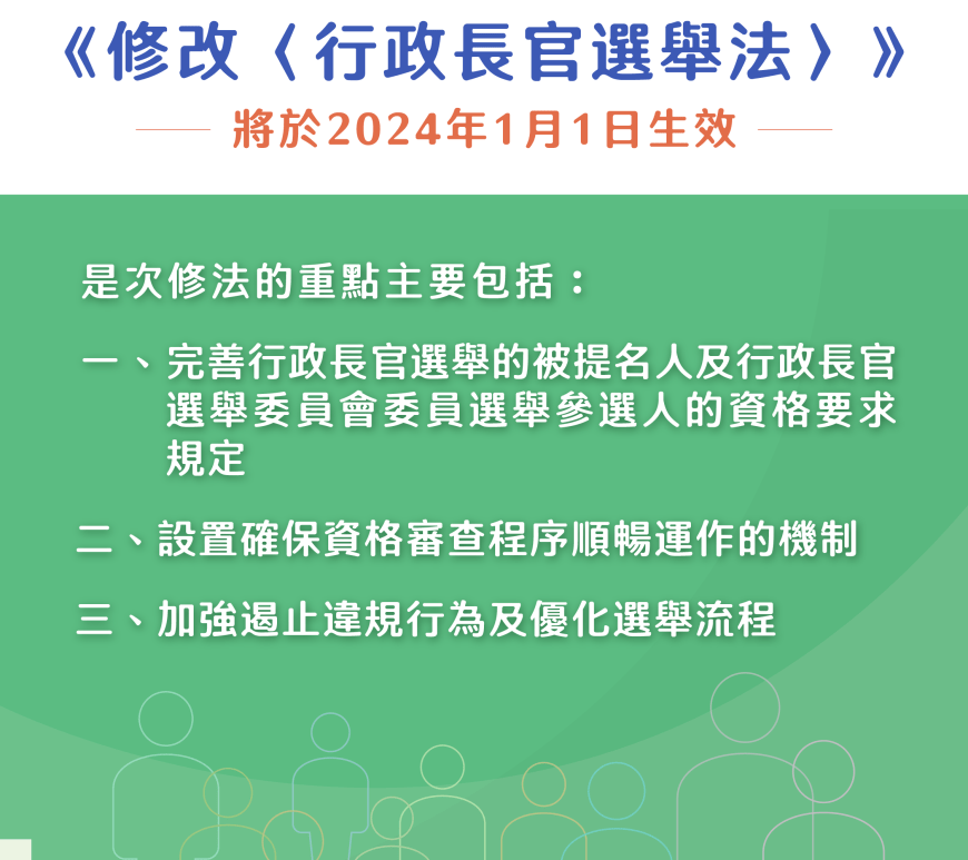第20/2023號法律《修改〈行政長官選舉法〉》於12月27日公佈,已於2024年1月1日生效,有關法律的生效標誌著澳門特區從法律制度和執行機制上進一步落實「愛國者治澳」原則。
