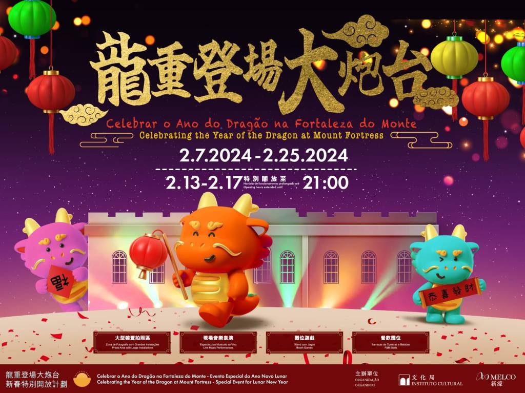 新濠博亞將於2月7日至25日在大炮台花園平台舉行「龍重登場大炮台」活動,將設置多個大型節日裝置拍照區供市民旅客拍照留影,包括 「鼓舞祥龍」「彩龍獻瑞」,以及 7米高的特大送福財神等。現場設有新春攤位遊戲及音樂表演助興,觀眾可品嚐特色小食和飲品,並有機會收到財神爺送上的吉祥祝福,感受新春節日歡樂。此外,大炮台花園於2月13日至17日期間開放時間將特別延長至晚上9時。