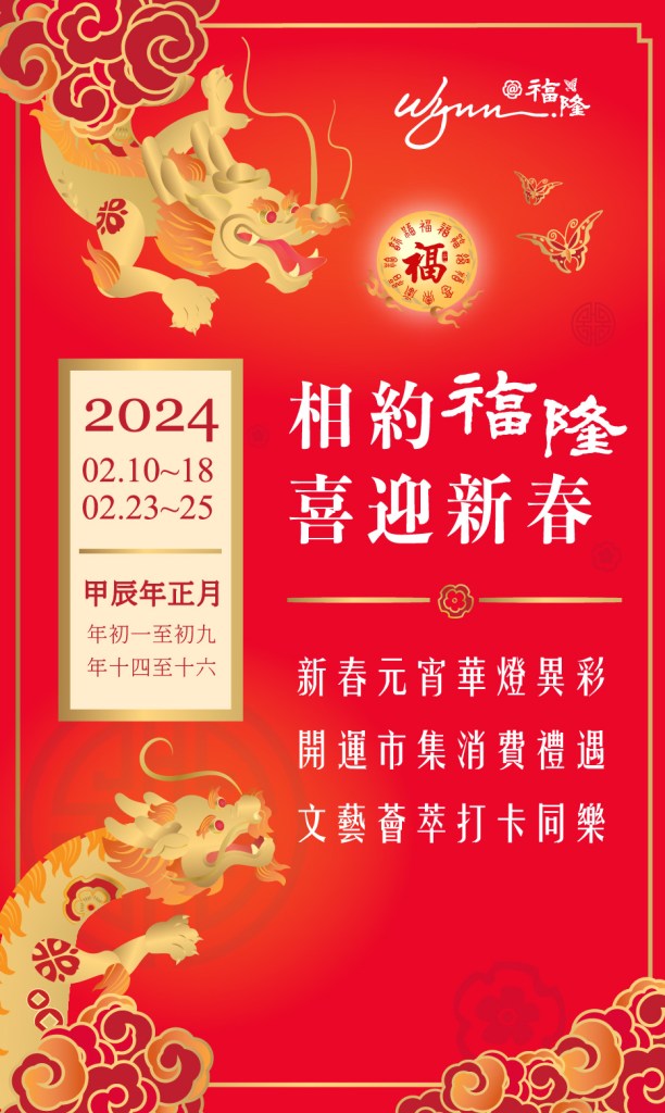 永利澳門將於2月10至18日以及23至25日期間,在福隆新街步行區佈置以福氣和龍年作為主題的新春裝飾,並有一系列精彩紛呈的活動項目,包括傳統文藝表演、文創市集、新春限定的特調雞尾酒以及曲奇套裝,並設有「活現福隆——福隆新街區文化旅遊導賞」,讓市民及遊客穿梭古街老巷和舊建築,瞭解該區昔日的歷史與文化,而在大年初一至初五期間, 「財神」將到場送上祝福,同時,設有以中國傳統服飾為主題的變裝攝影服務,讓市民及遊客感受福隆節日魅力。