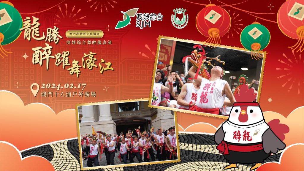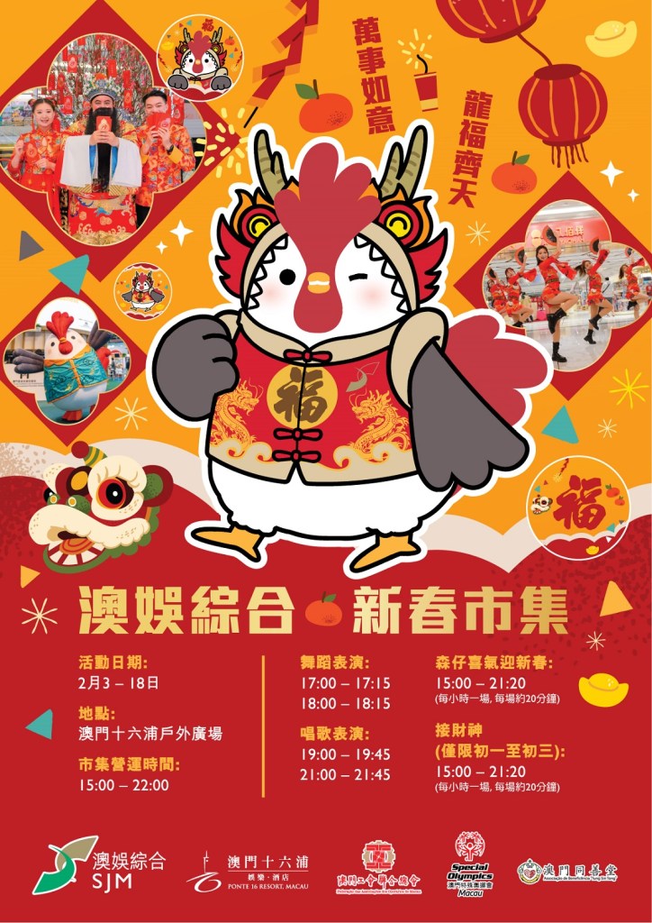 澳娛綜合將於2月3日至18日期間在澳門十六浦度假村戶外廣場舉行「澳娛綜合新春市集」,集結本地16間中小企、多個社團及慈善機構,設置藝文產品、創意手作、節慶小食、互動遊戲及慈善義賣等攤位,並在特定時間送上歌舞表演、接財神等活動,在2月17日(年初八)下午2時,澳門鮮魚行總會呈獻「舞醉龍」非遺項目表演,向市民旅客送上龍年祝福。同時,為彰顯新馬路一帶的藝文活力,將設有大型燈飾及藝術燈光裝置,在活動期間晚上6時至10時上演「新馬路閃起來」 幻彩燈光表演,共同打造喜慶新春。