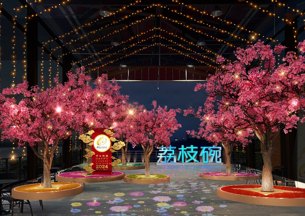 銀河娛樂集團於2月10日至14日(大年初一至初五)期間,將以桃花為主題在荔枝碗船廠片區設置特色新春場景,並於下午6時至晚上9時上演「紅桃」大展燈光表演,市民和旅客可在船廠迷人的自然景致下欣賞到百花齊放的盛景,財神及「小淘淘」將在特定時間現身送上祝福,屆時將特設免費穿梭巴士往返「澳門銀河」及荔枝碗船廠片區。