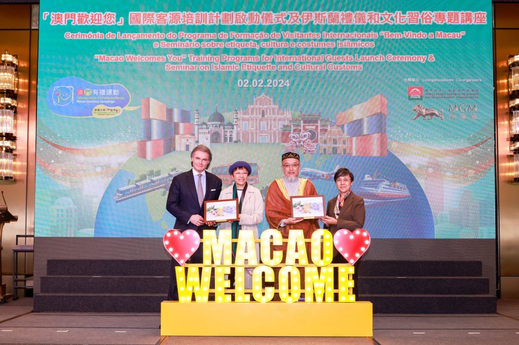 「澳門歡迎您」國際客源培訓計劃啟動儀式及首場講座 – 「伊斯蘭禮儀和文化習俗專題講座」今(2日)舉行,旅遊局局長文綺華、美高梅酒店業務高級副總裁狄艾文博士、澳門伊斯蘭會丁少杰教長和香港三亨事務所有限公司董事總經理梁雪花女士,以及星級旅遊服務認可計劃支持單位代表、一眾旅遊及相關業界代表、從業員和院校學生等合共逾500人出席。