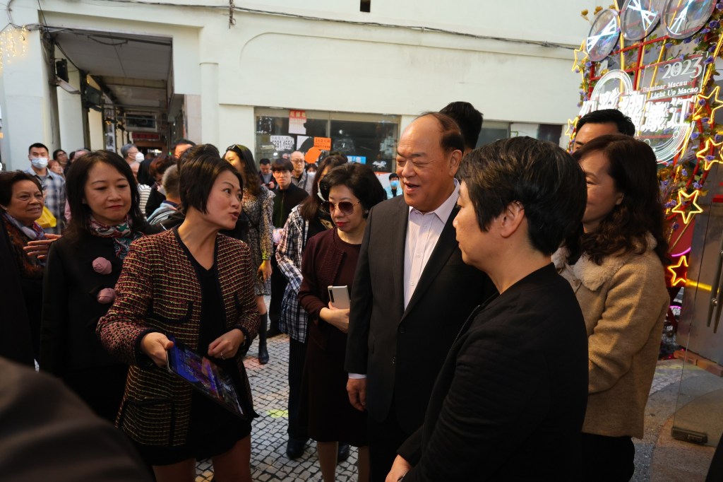其後,行政長官前往福隆新街步行區,觀賞由永利澳門帶來的新春裝飾、文藝表演及文創市集,體驗文化創意與古街老巷和舊建築的結合,同時瞭解金碧文娛中心的現況,欣賞了澳娛綜合呈獻的「新馬路閃起來」 幻彩燈光表演。