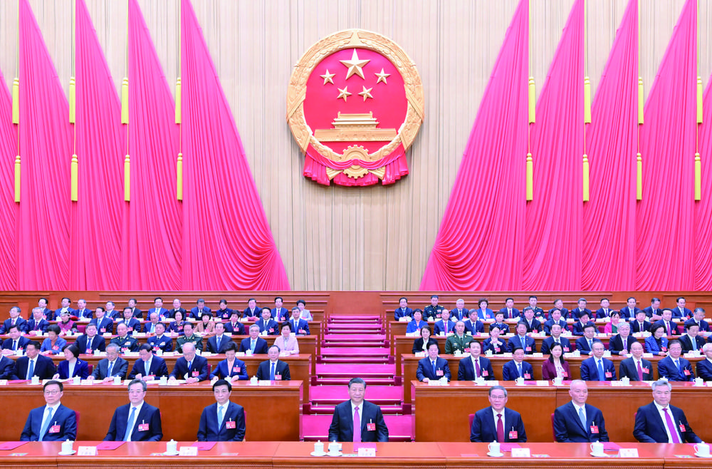 習近平、李強、王滬寧、蔡奇、丁薛祥、李希、韓正和大會主席團成員在主席台就座。