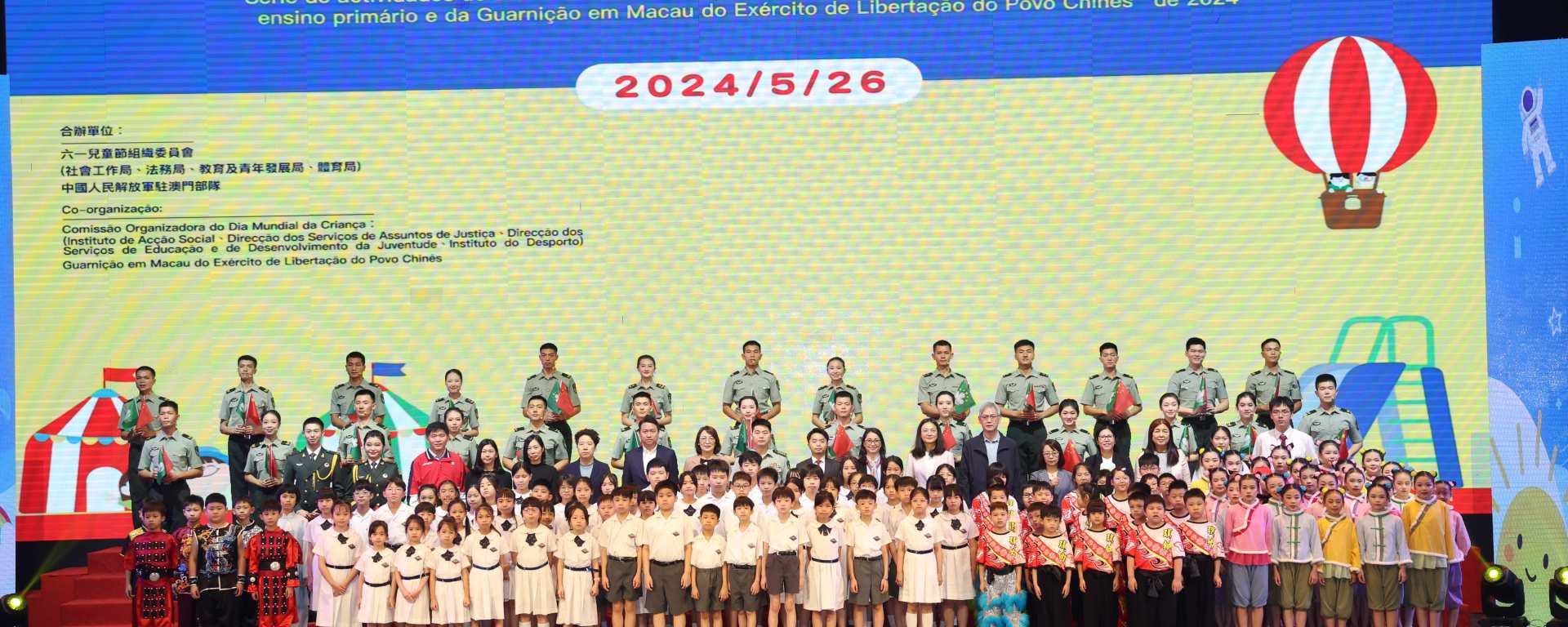 為了慶祝六月一日國際兒童節,讓本澳小學生感受節日氣氛的同時,亦能加強與中國人民解放軍駐澳門部隊的互動交流,提升小學生的民族意識,弘揚愛國愛澳精神,由教育及青年發展局、社會工作局、法務局、體育局組成的「六.一國際兒童節組織委員會」和中國人民解放軍駐澳門部隊合辦的2024年「六.一國際兒童節系列活動——小學生與中國人民解放軍駐澳門部隊文藝表演」已於5月26日上午假氹仔軍營順利舉行。
