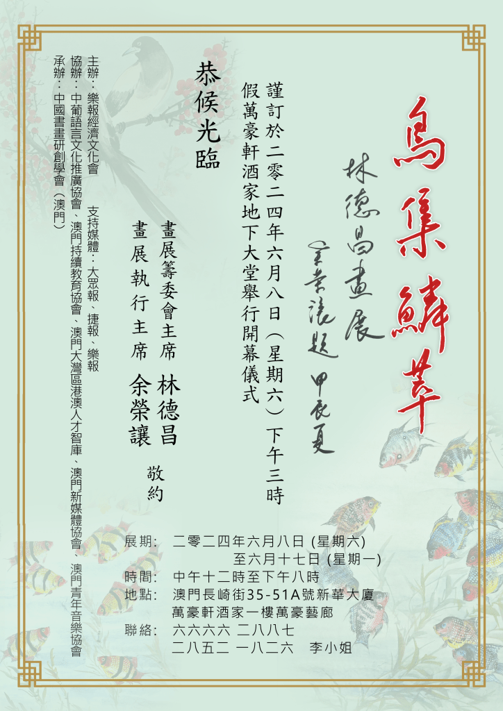 由樂報經濟文化會主辦,中葡語言文化推廣協會、澳門持續教育協會、澳門大灣區港澳人才智庫、澳門新媒體協會及澳門青年音樂協會協辦,中國書畫研創學會(澳門)承辦,大眾報、捷報、樂報支持:「鳥集鱗萃——林德昌畫展」將於本月八日(星期六)下午三時假萬豪軒酒家地下大堂舉行開幕儀式,展出林德昌精選作品共七十幀,同場首發林德昌畫展作品集——《鳥集鱗萃》。