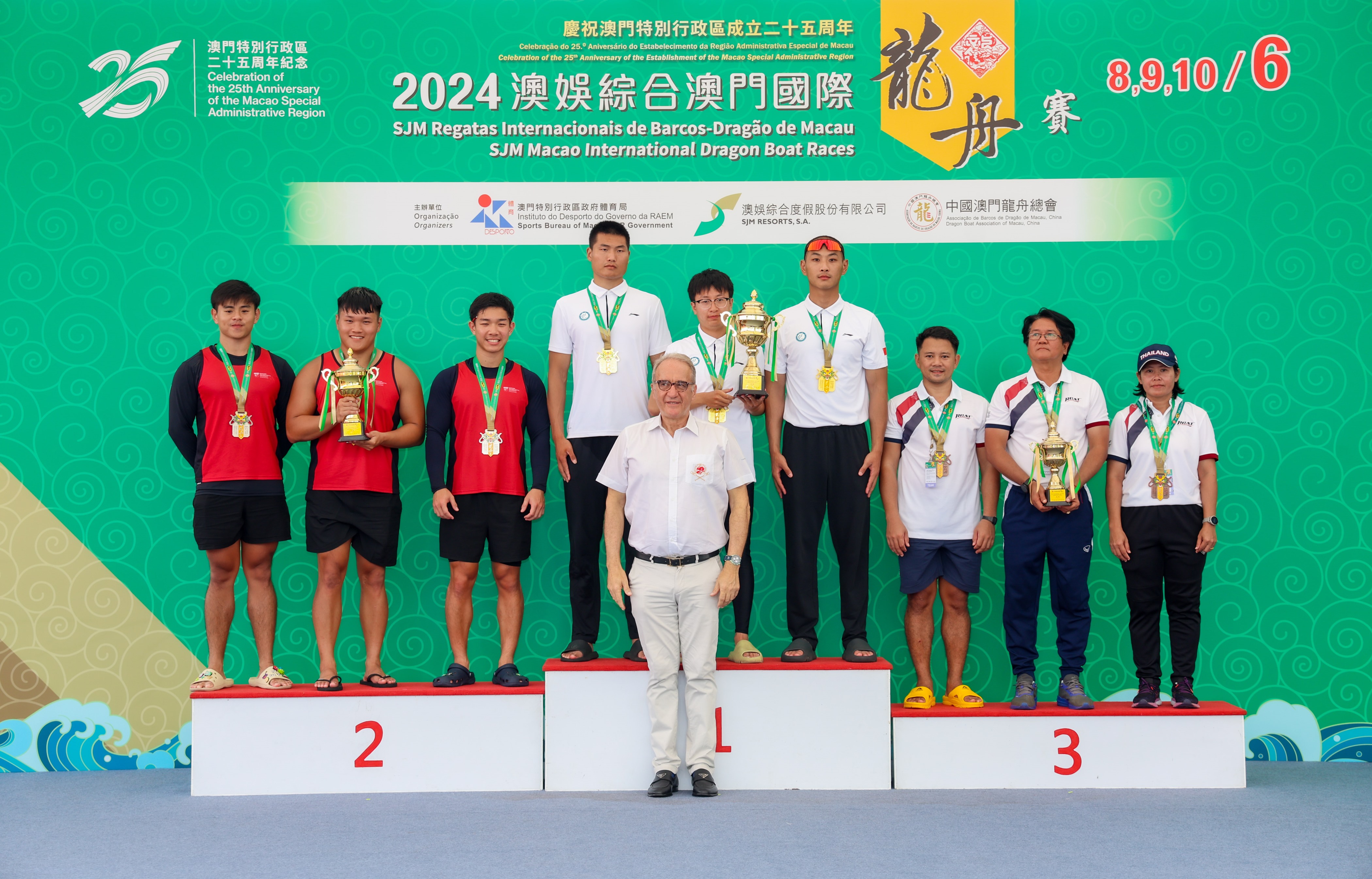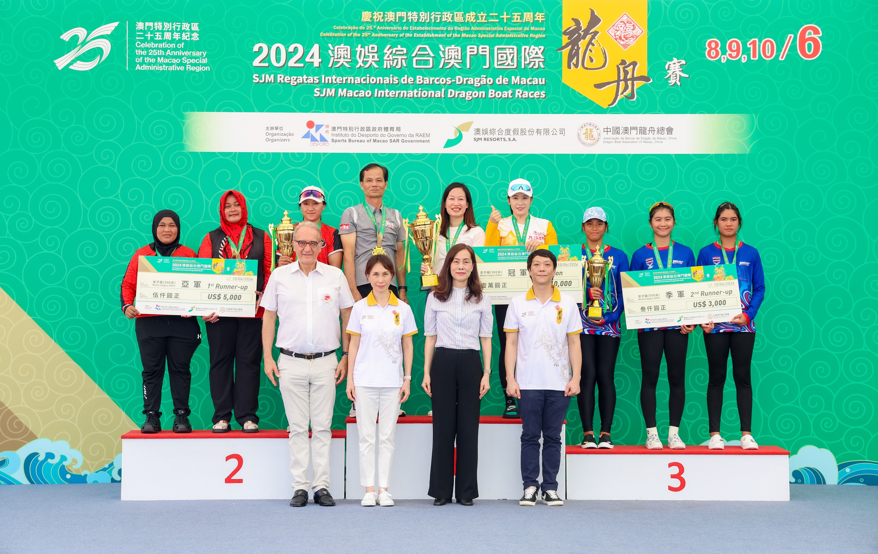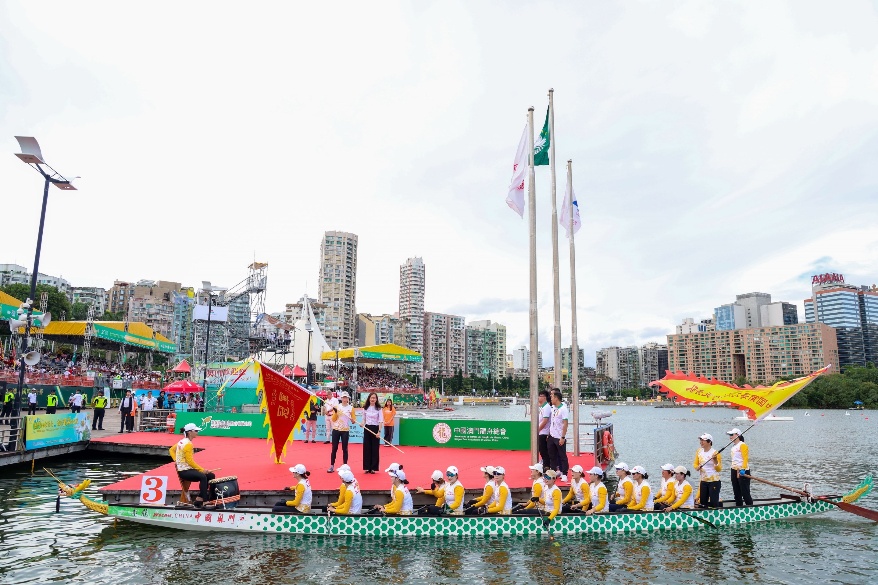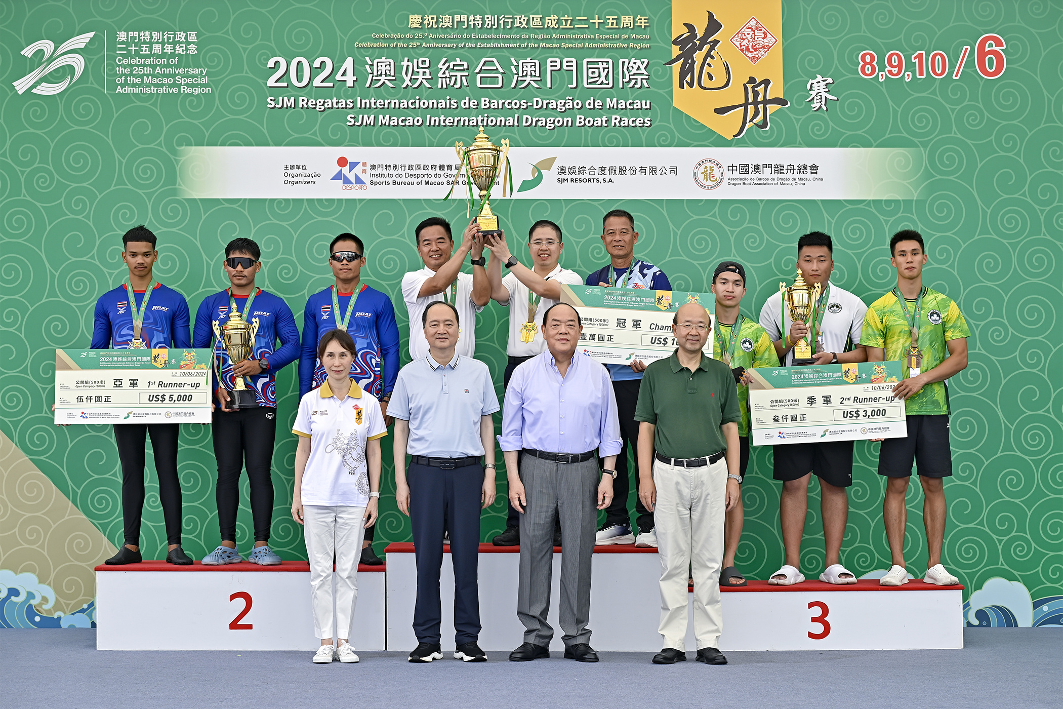 由體育局、澳娛綜合度假股份有限公司、中國澳門龍舟總會主辦,市政署及行政公職局協辦的「慶祝澳門特別行政區成立25周年-2024澳娛綜合澳門國際龍舟賽」於6月10日端午節正日於南灣湖水上活動中心進行壓軸的賽事。最終中國南海九江分別衛冕澳門國際龍舟邀請賽標準龍500米公開組及女子組冠軍,而大學生邀請賽標準龍500米公開組由聊城大學奪得。行政長官賀一誠出席活動觀賞龍舟賽事,並主持點睛儀式及頒獎。
