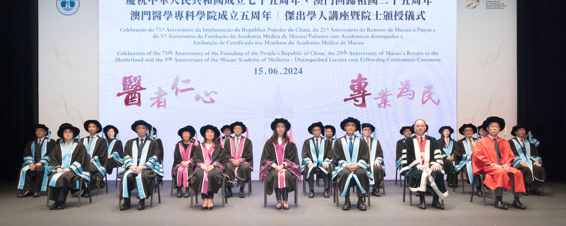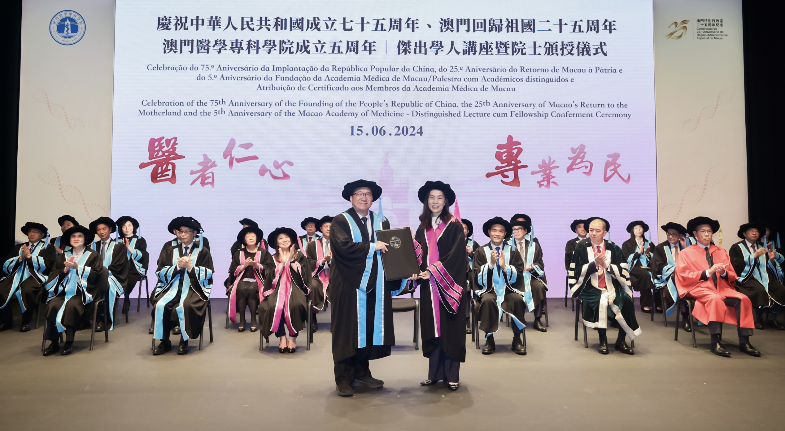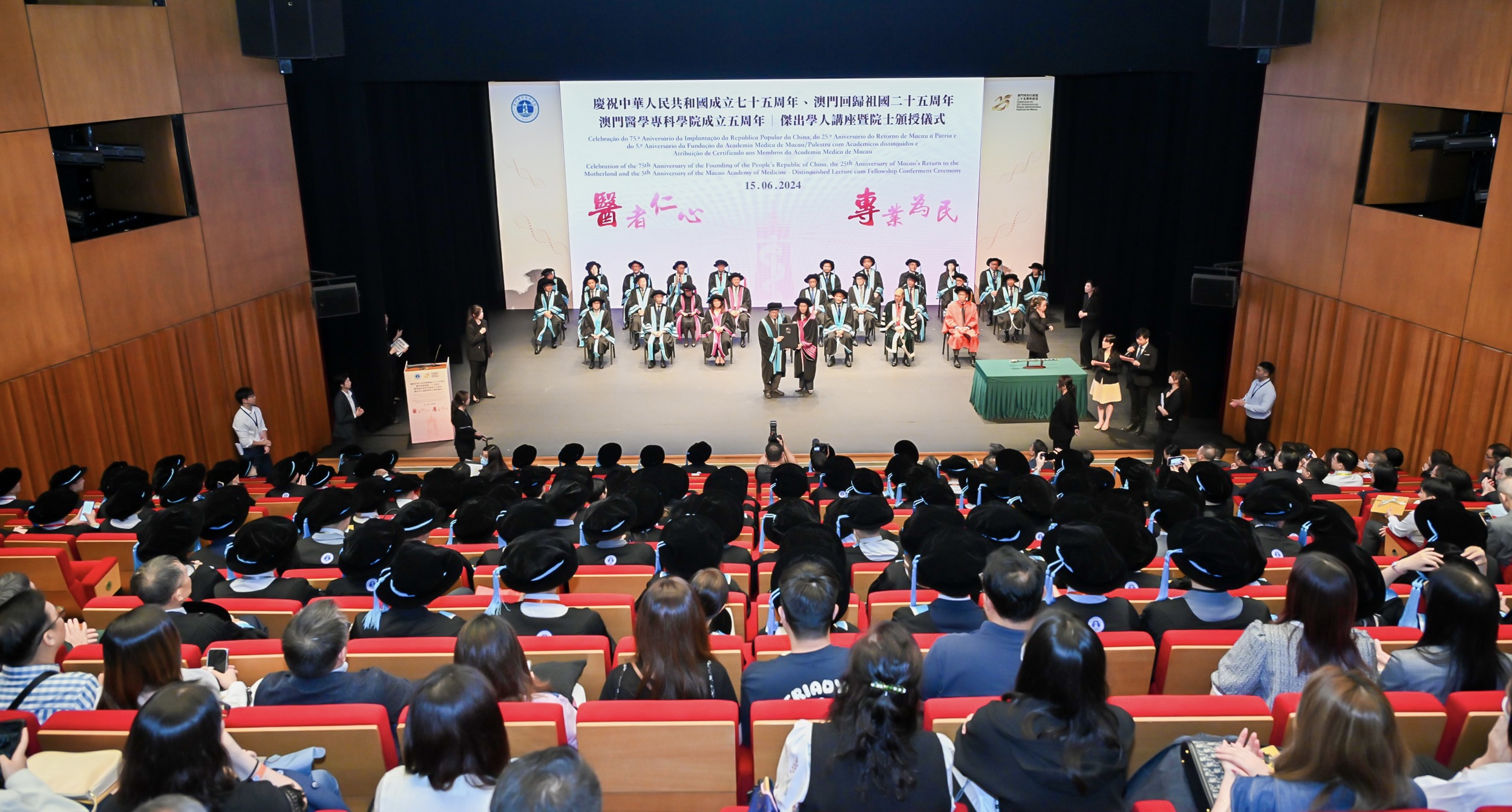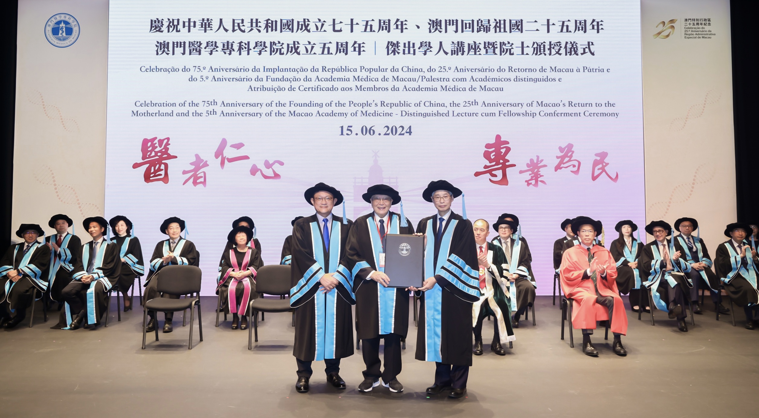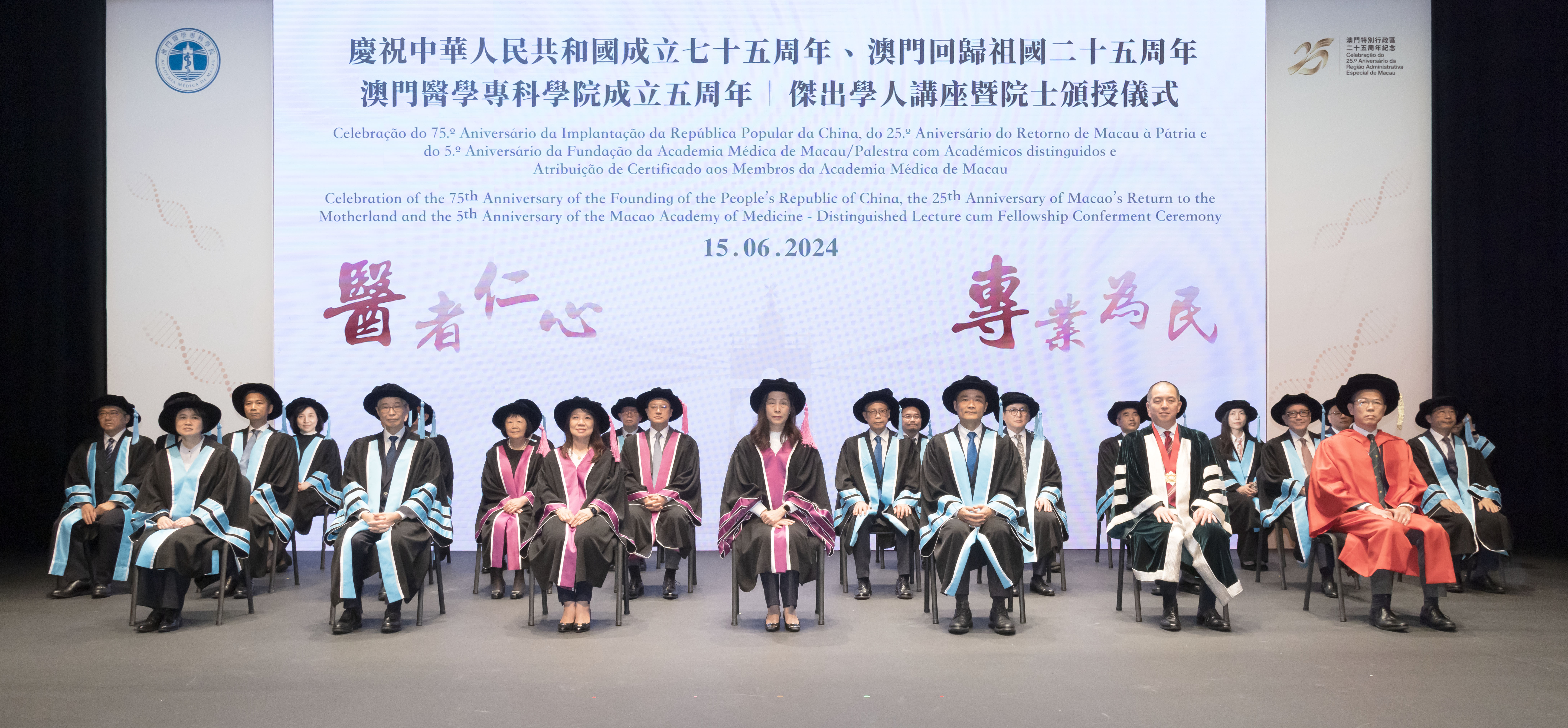為慶祝中華人民共和國成立75周年、澳門回歸祖國25周年、澳門醫學專科學院成立5周年,衛生局轄下澳門醫學專科學院於6月15日,假澳門文化中心舉行傑出學人講座暨2024年度院士頒授儀式。儀式由社會文化司歐陽瑜司長、社會文化司司長辦公室何鈺珊主任、衛生局羅奕龍局長、香港醫學專科學院梁嘉傑主席、香港大學李嘉誠醫學院劉澤星院長、澳門醫學專科學院專業委員會熊志添主席共同主禮。此外,還有20多位來自內地及香港的嘉賓、本澳醫療機構代表及澳門醫學專科學院架構成員等出席了是次典禮。