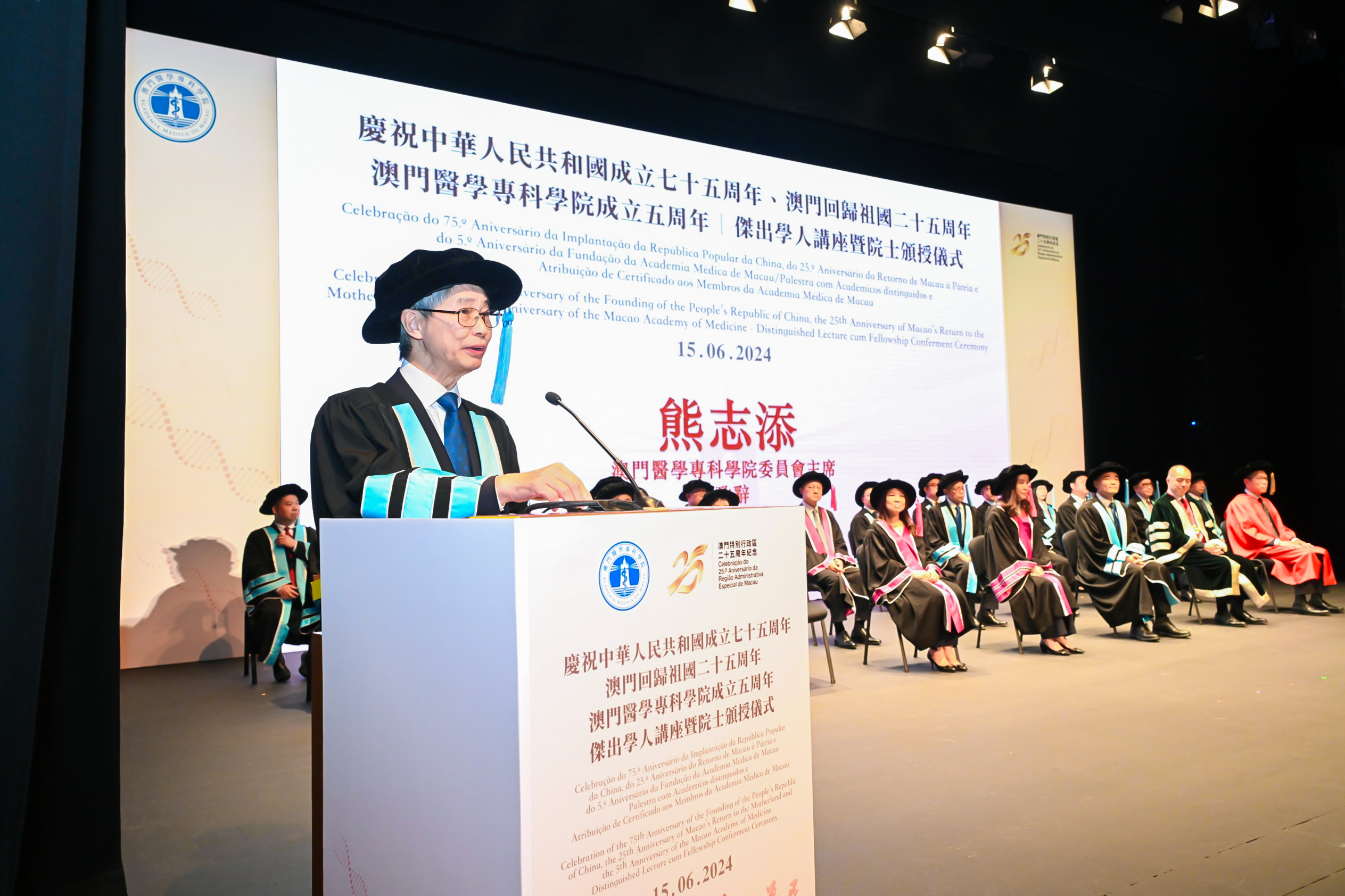 熊志添主席致辭時勉勵獲頒授院士,指出在人工智能及其應用助推下,醫學科學以驚人速度不斷向前發展,寄語院士應以最前沿的醫學科學知識及先進醫學技術來武裝和充實自我,以應對未來各種挑戰。他又強調,學院自成立以來得到特區政府大力支持,過去5年在全體架構成員及一眾院士的齊心協力下,完成多項重要任務,包括建立統一本澳公共和私人領域醫學專科培訓的制度及計劃、推動本澳設立專科醫生資格認可制度及專科培訓單位認證制度,並順利完成學院第一個延續醫學教育/持續專業發展(CME/CPD)周期;與此同時,重新出版《澳門醫學雜誌》,持續對外開展專科醫療交流合作等,各項工作成果為提升澳門專科醫生培訓質量、促進澳門專科醫生專業發展提供了新的、廣闊的發展空間。