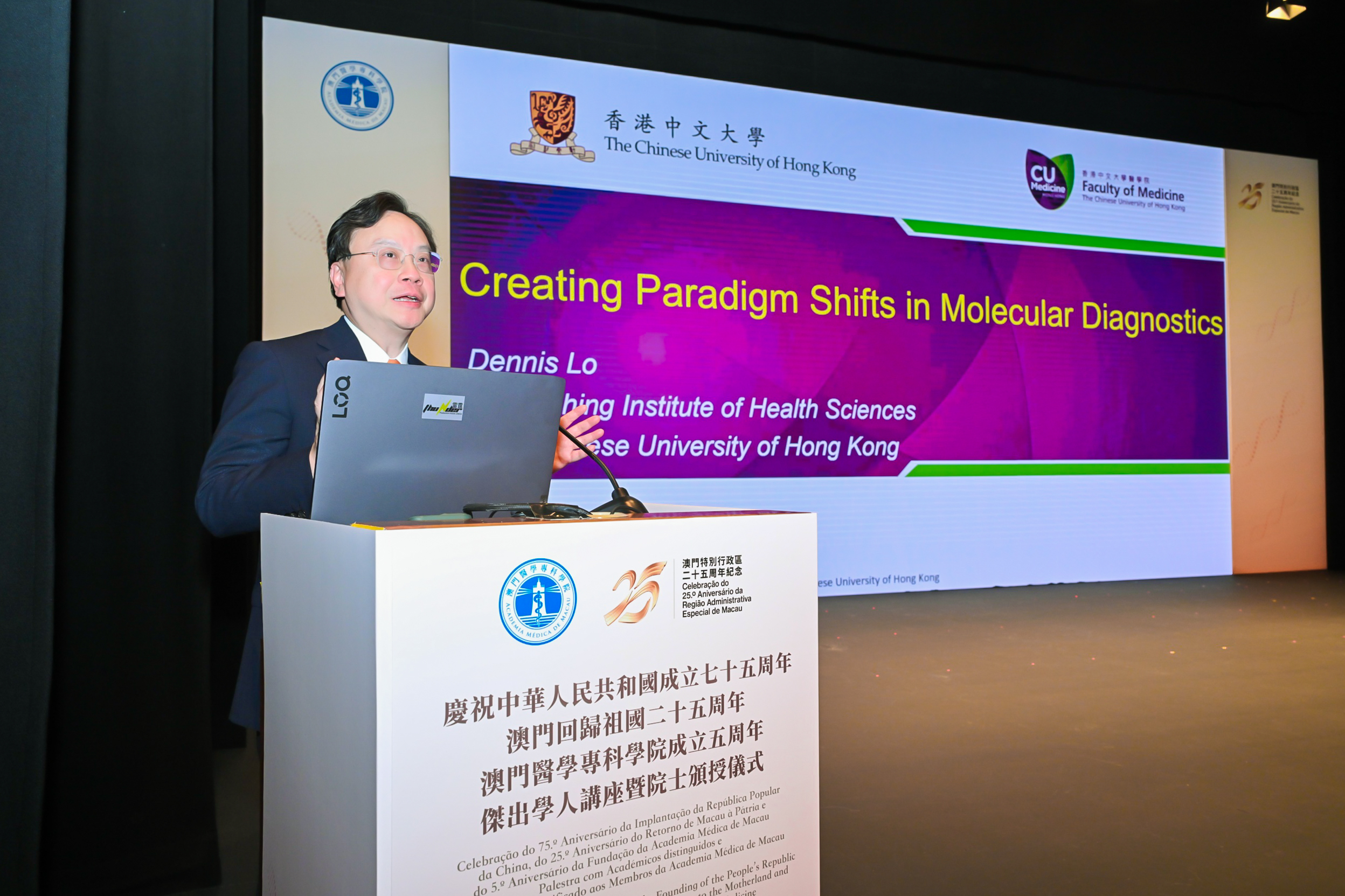 本次傑出學人講座邀請到中國科學院院士、香港科學院院長、被譽為「無創產前檢查之父」的國際著名分子生物學學者盧煜明教授,發表主題為《創造分子診斷範式轉換》的專題演講,盧煜明教授進一步探討把該技術轉化到分子診斷的其他領域,例如早期癌症篩查等領域的前沿發展。盧煜明教授亦是澳門大學榮譽理學博士、香港中文大學醫學院李嘉誠醫學講座教授,於1997年發現孕婦血漿中含有高濃度的胎兒DNA,並研發出一套檢測新技術,避免因羊膜穿刺檢查而導致高風險。