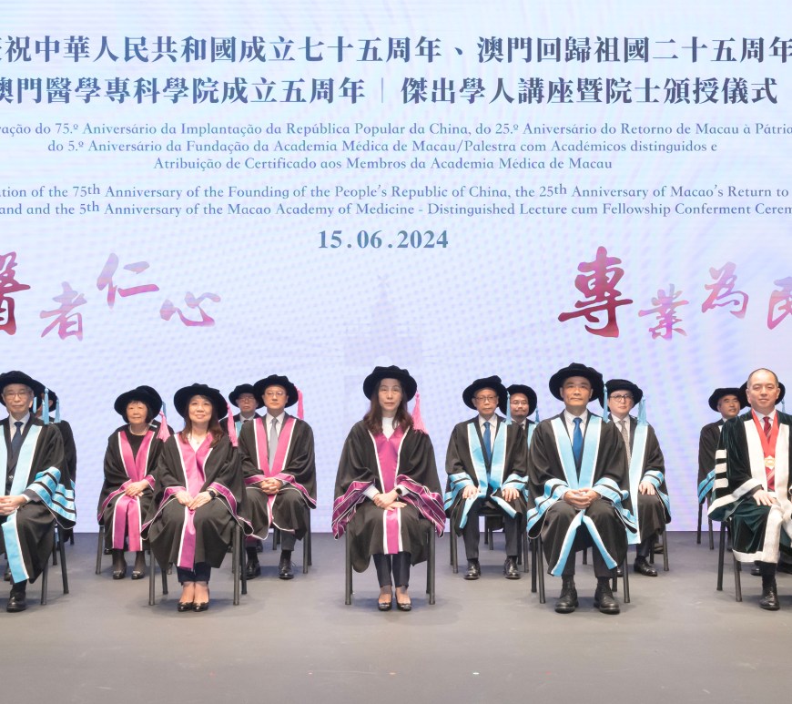 為慶祝中華人民共和國成立75周年、澳門回歸祖國25周年、澳門醫學專科學院成立5周年,衛生局轄下澳門醫學專科學院於6月15日,假澳門文化中心舉行傑出學人講座暨2024年度院士頒授儀式。儀式由社會文化司歐陽瑜司長、社會文化司司長辦公室何鈺珊主任、衛生局羅奕龍局長、香港醫學專科學院梁嘉傑主席、香港大學李嘉誠醫學院劉澤星院長、澳門醫學專科學院專業委員會熊志添主席共同主禮。此外,還有20多位來自內地及香港的嘉賓、本澳醫療機構代表及澳門醫學專科學院架構成員等出席了是次典禮。
