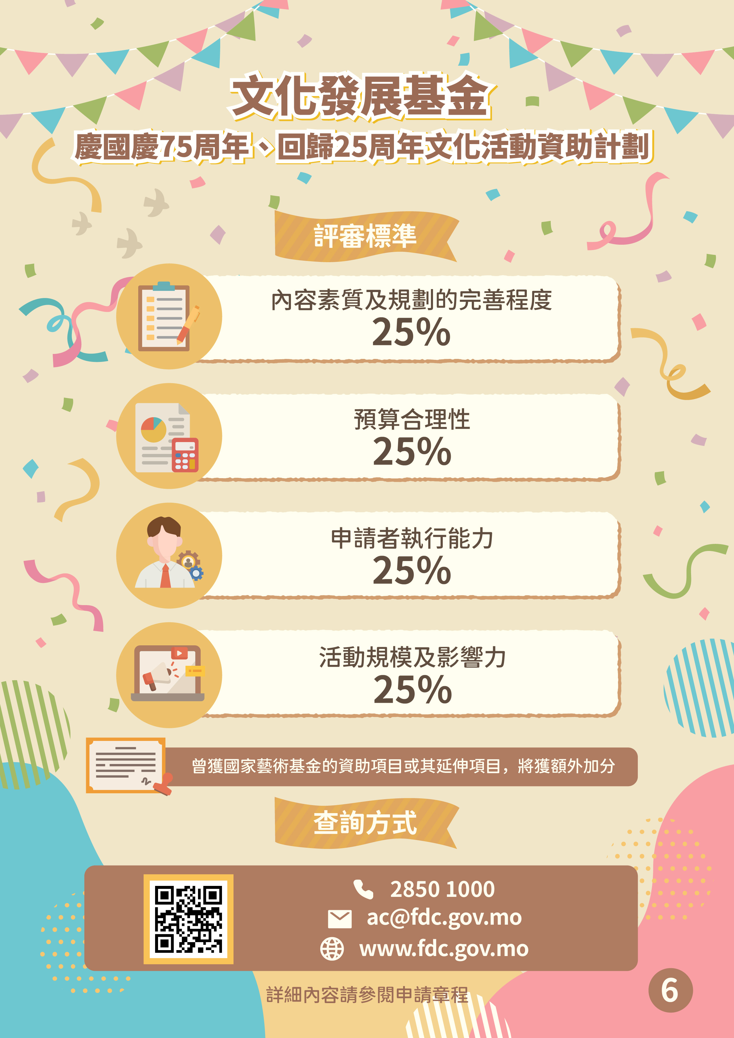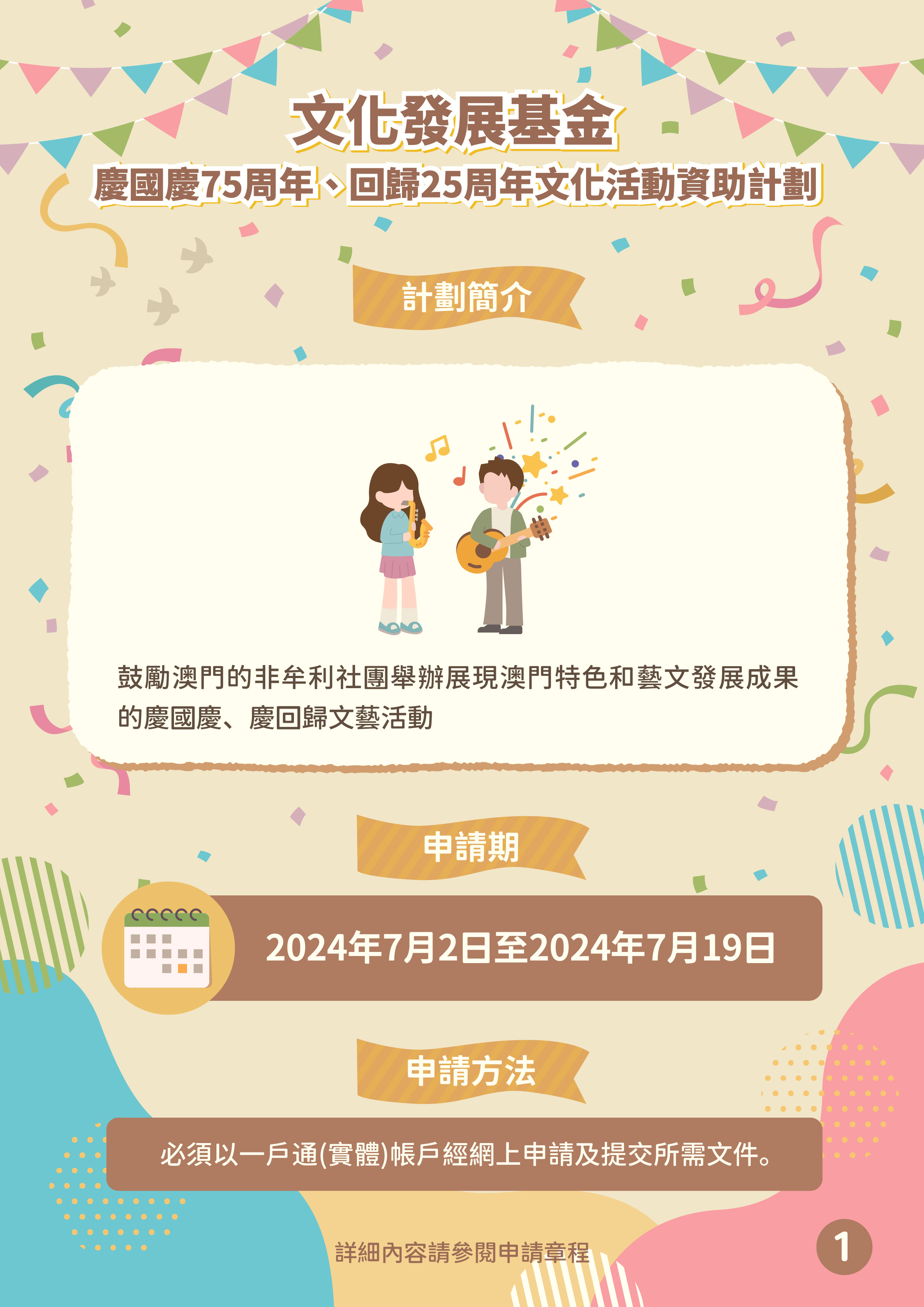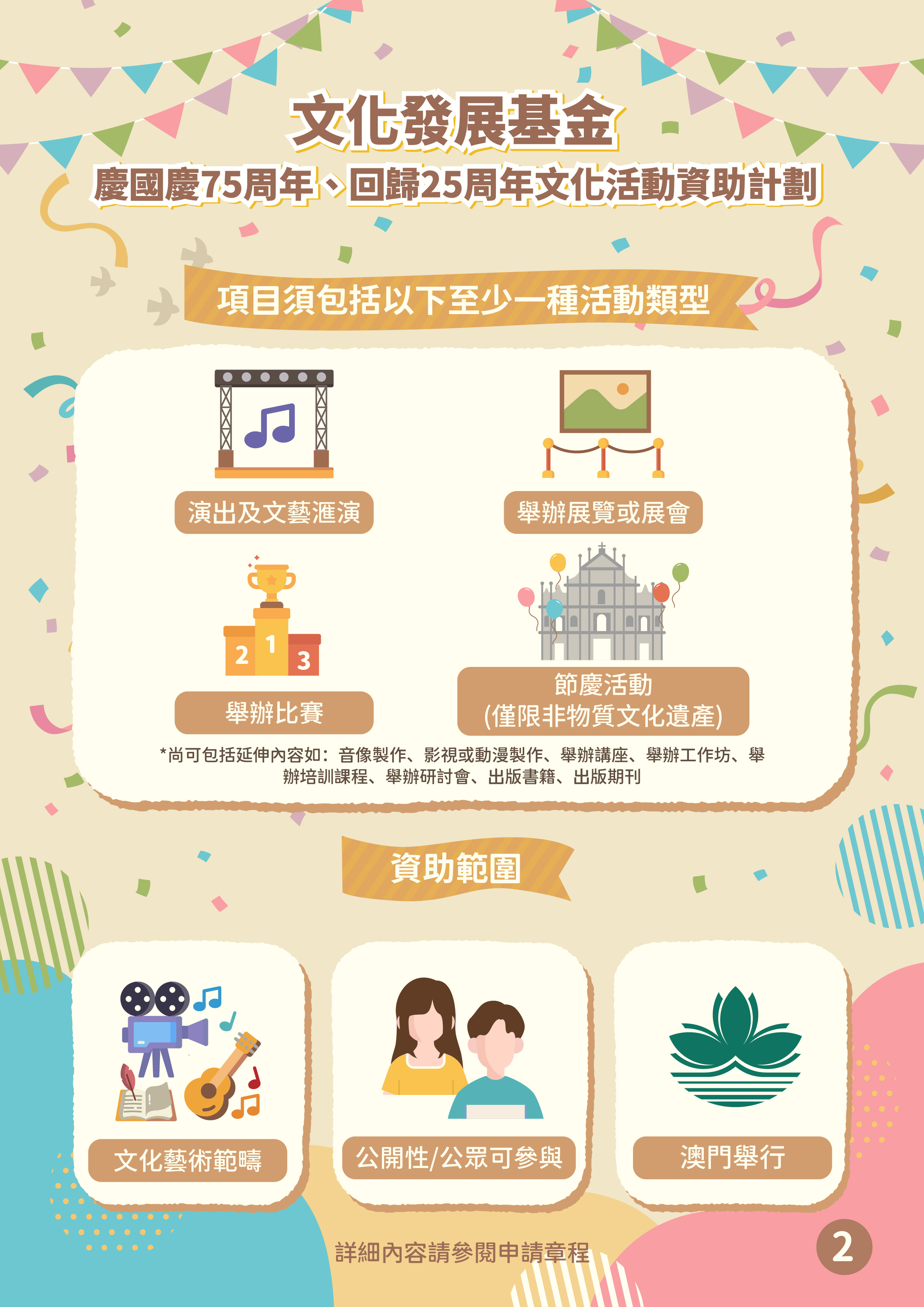 為慶祝中華人民共和國成立75周年、澳門回歸祖國25周年,文化發展基金推出「慶國慶75周年、回歸25周年文化活動資助計劃」,鼓勵澳門依法成立的非牟利社團舉辦展現澳門特色和藝文發展成果的慶國慶、賀回歸的文藝活動,提升全澳門的喜慶氛圍,進一步推動社會廣泛參與,同賀雙慶盛事。