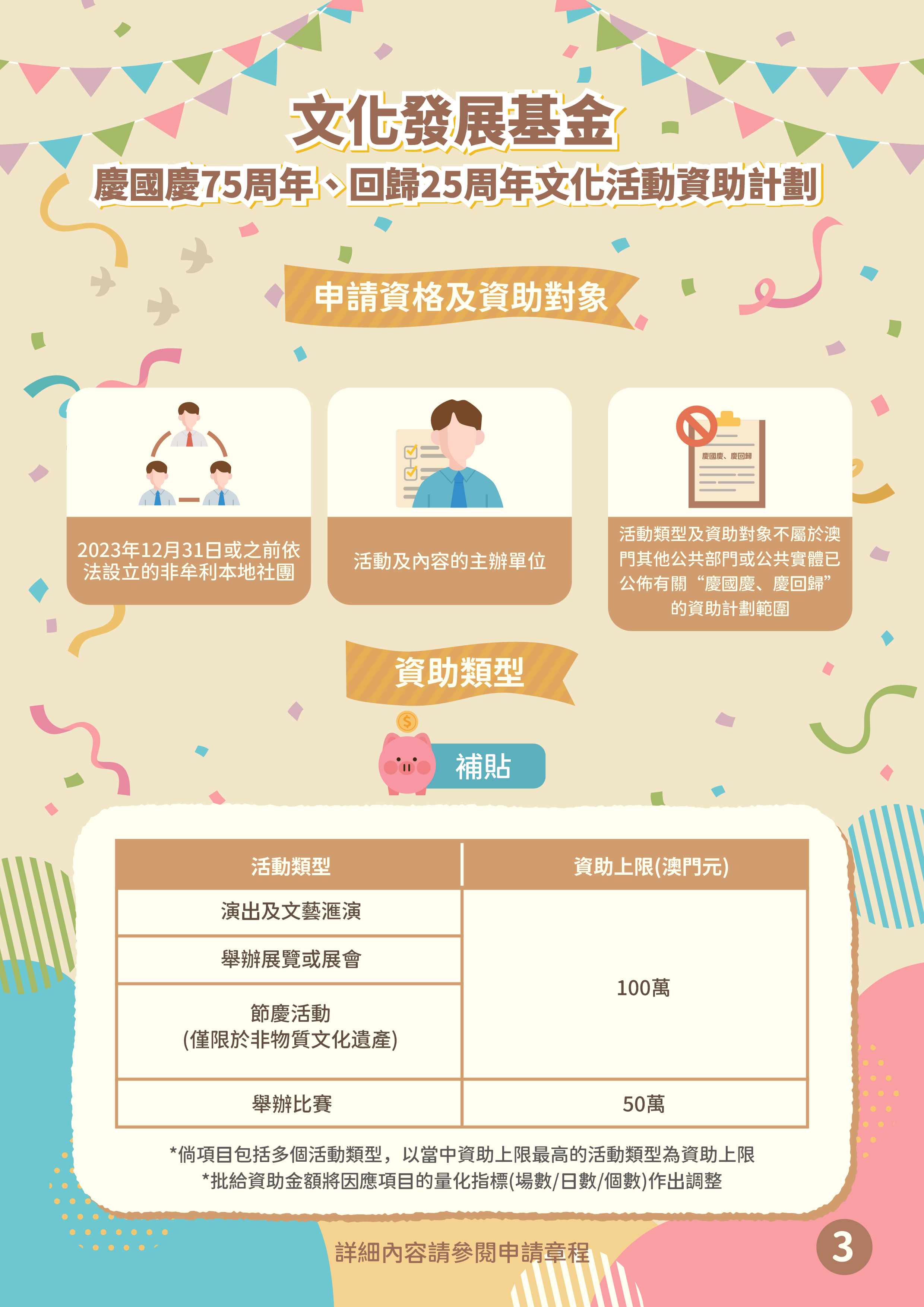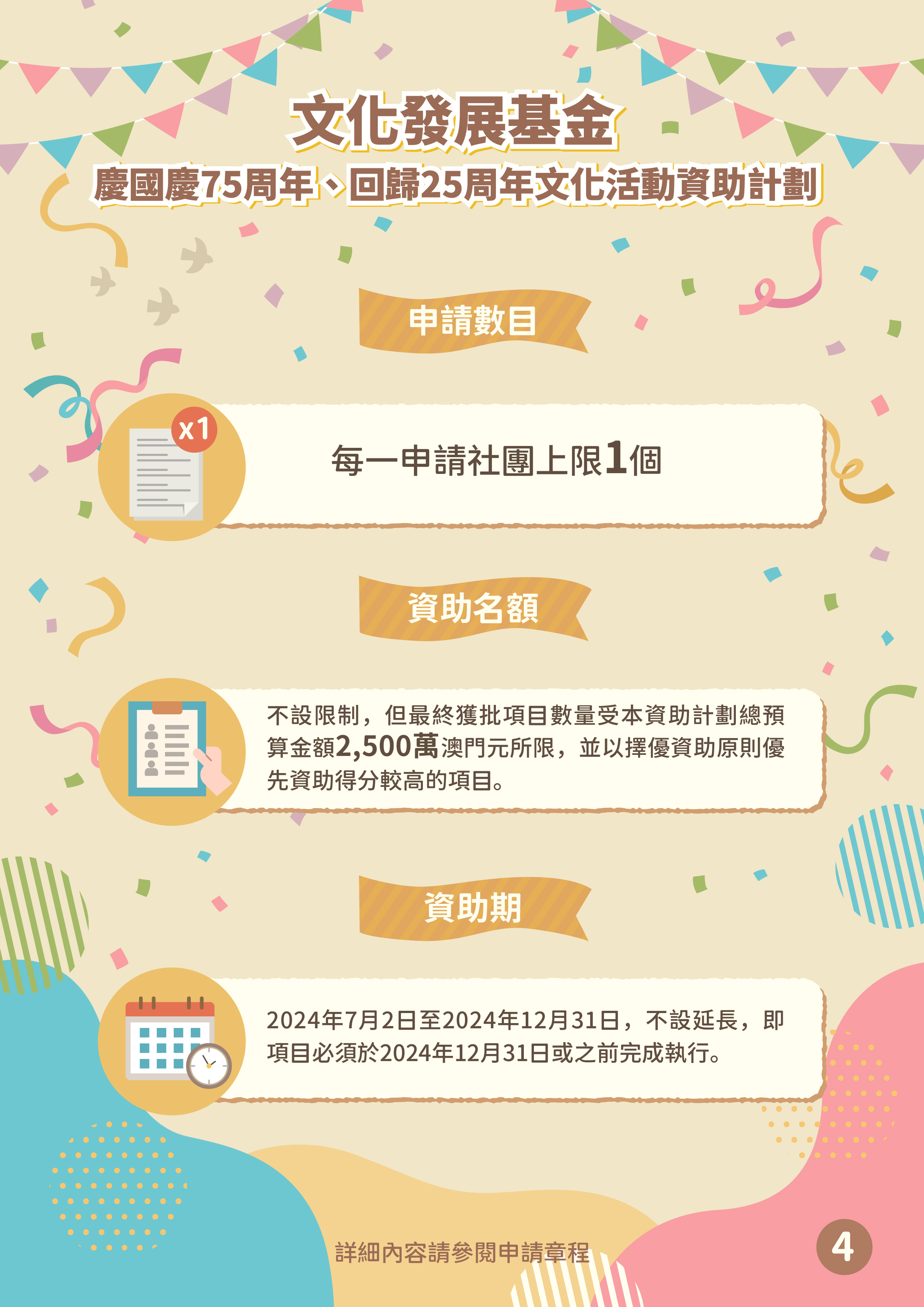 申請社團須為於2023年12月31日或之前依法設立的非牟利本地社團,且為申請活動及內容的主辦單位;此外,申請項目的活動類型及資助對象,不能同時屬於澳門其他公共部門或公共實體已公佈有關「慶國慶、慶回歸」的資助計劃範圍。每一申請社團只限申請一個項目,資助補貼上限按活動類型分別為50萬及100萬澳門元,且受本資助計劃總預算金額2,500萬澳門元所限,基金將擇優資助取得較高評審分數的項目。資助期由2024年7月2日至2024年12月31日,不設延長,即項目必須於2024年12月31日或之前完成執行。