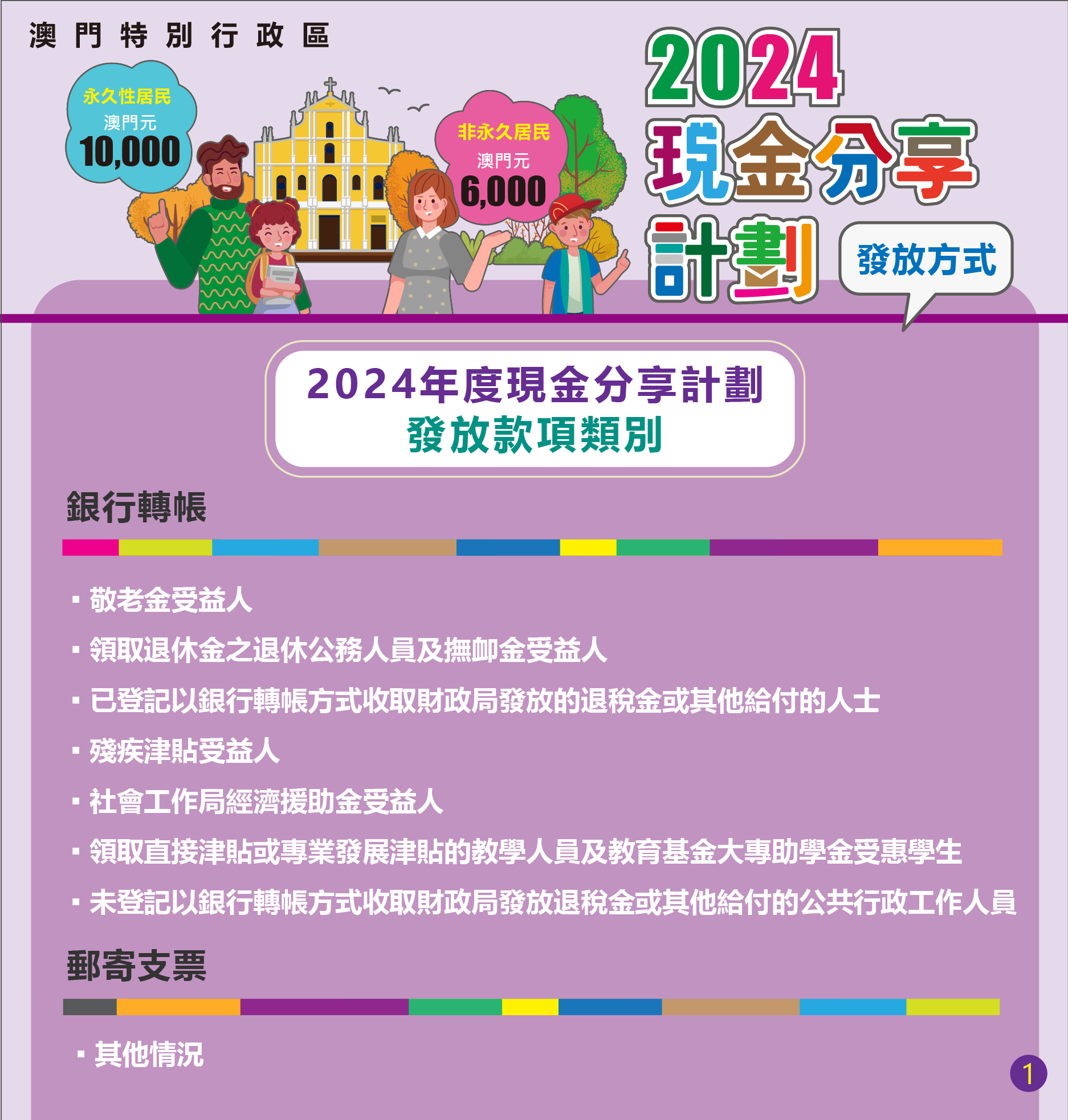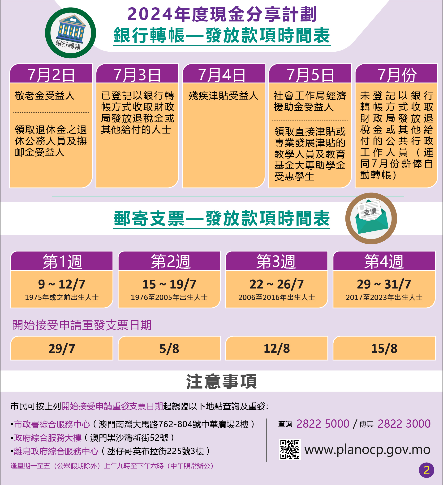 《2024年度現金分享計劃》自7月2日起至7月31日透過銀行轉帳或郵寄劃線支票兩種方式,有序向717,018名合資格的澳門永久性居民每人發放1萬澳門元,以及向30,850名合資格的非永久性居民每人發放6千澳門元。