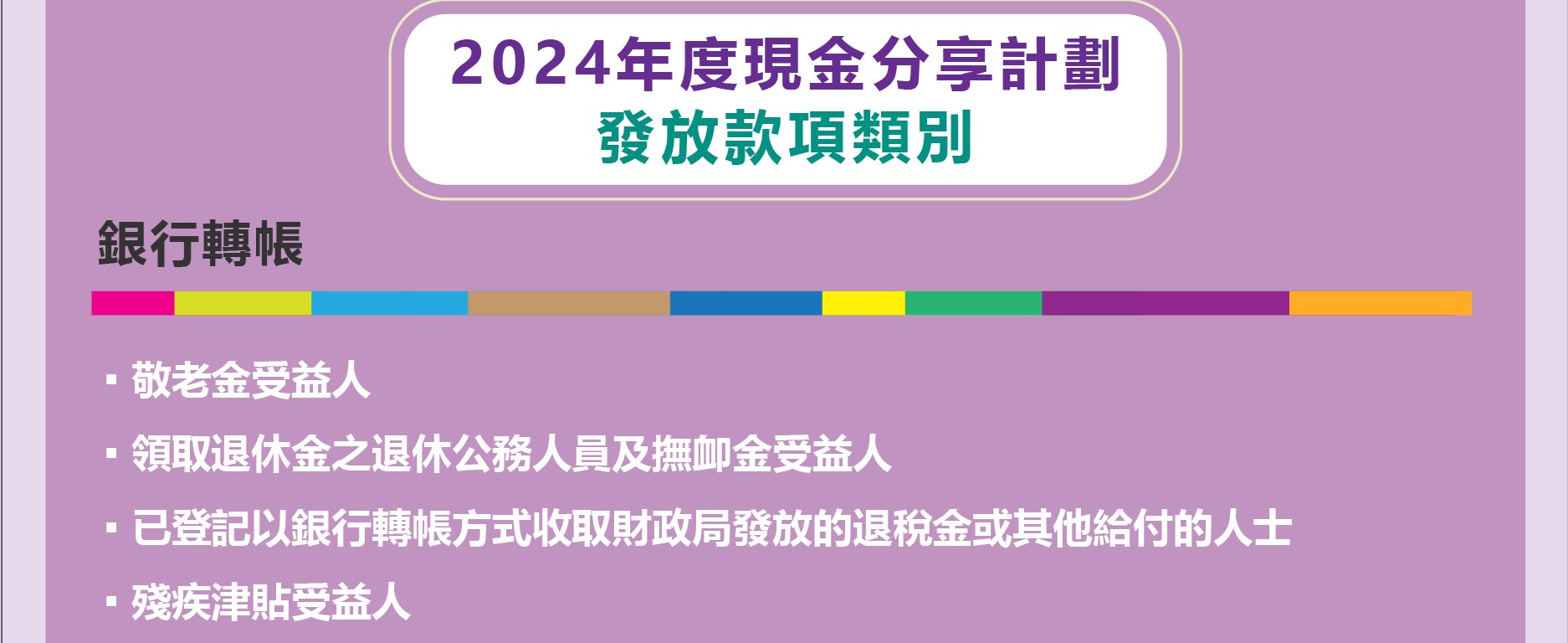 7月2日起以銀行轉帳的受惠對象為︰(1)敬老金受益人、(2)領取退休金之退休公務人員及撫卹金受益人、(3)已登記以銀行轉帳方式收取財政局發放退税金或其他給付的人士、(4)殘疾津貼受益人、(5)社會工作局經濟援助金受益人、(6)領取直接津貼或專業發展津貼的教學人員及教育基金大專助學金受惠學生、(7)未登記以銀行轉帳方式收取財政局發放退税金或其他給付的公共行政工作人員,以上凡合資格獲發放2024年度現金分享計劃款項之人士,將透過銀行轉帳形式發放。