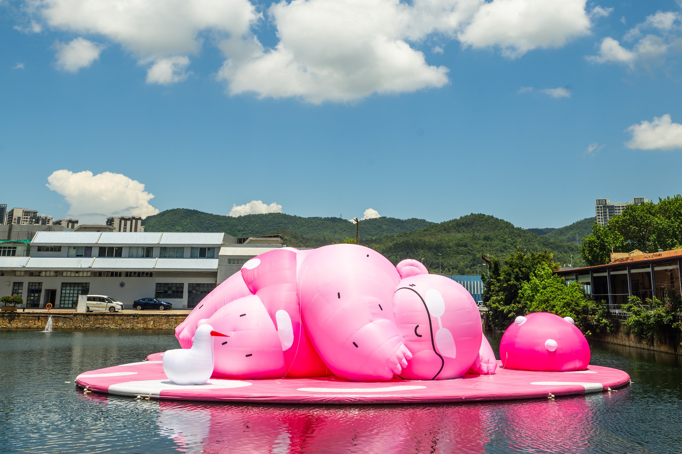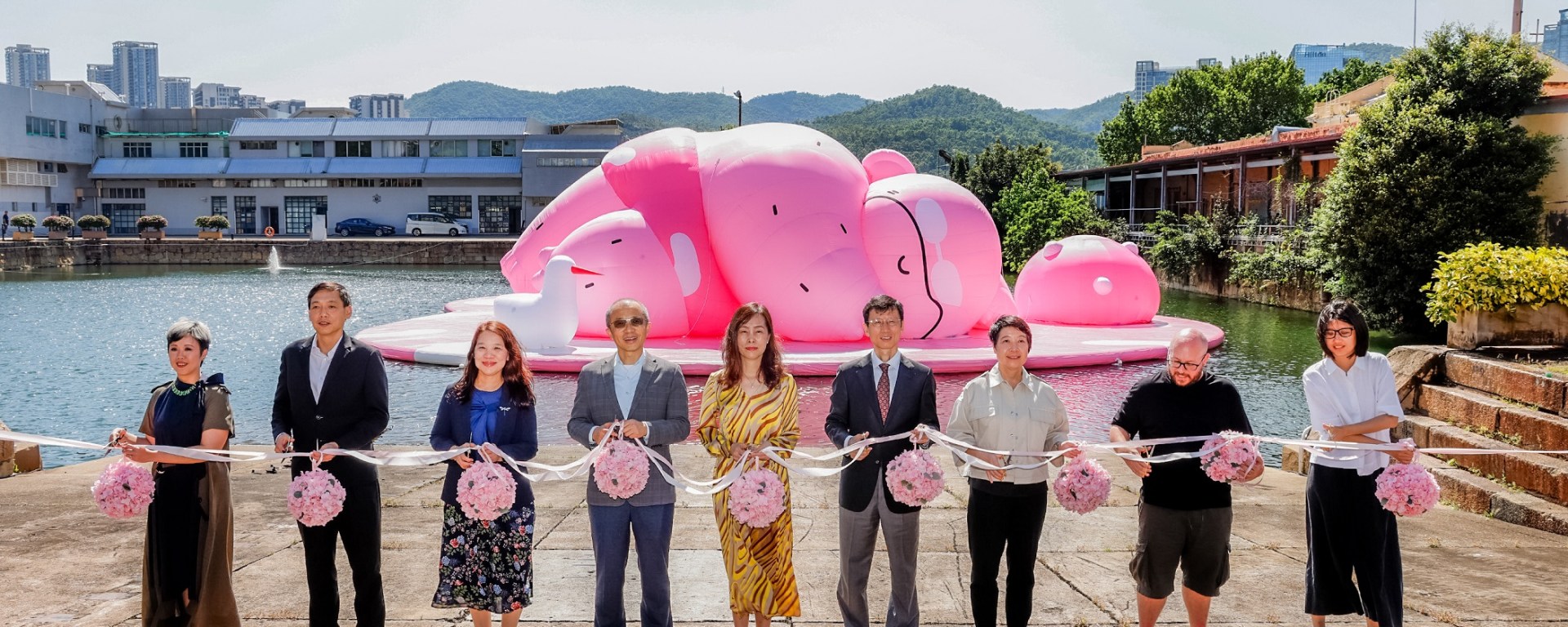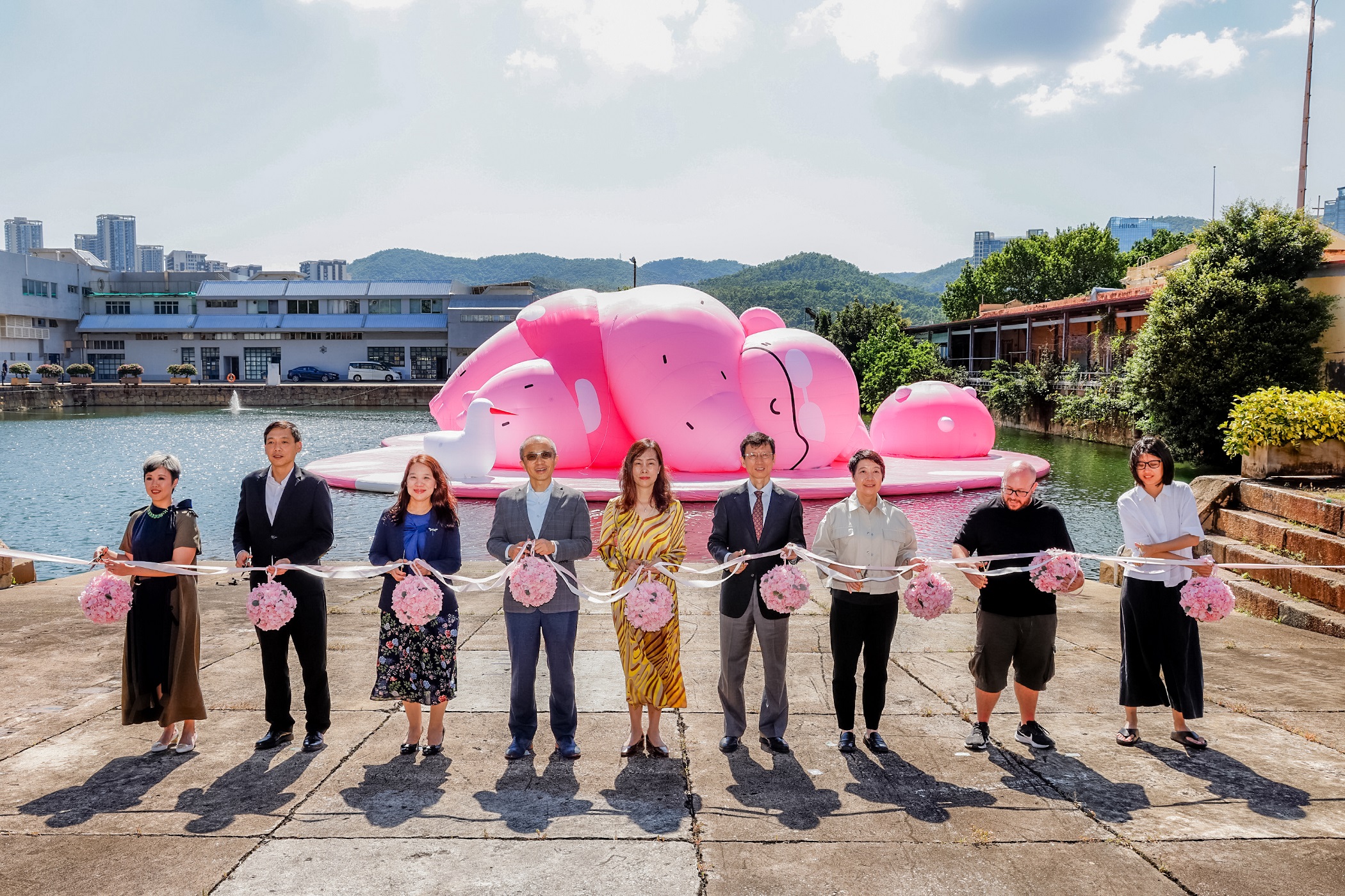 分享會完畢後,美高梅於媽閣塘為系列頭炮活動—大型公共充氣藝術裝置《BERTILO粉小胖游塘》舉行開幕儀式,由澳門特別行政區政府社會文化司司長歐陽瑜;中央人民政府駐澳門特別行政區聯絡辦公室宣傳文化部副部長殷汝濤;社會文化司司長辦公室主任何鈺珊;文化局局長梁惠敏;旅遊局代局長許耀明;《BERTILO粉小胖游塘》作品創始組合Bertil Butturini 及 Jingo Li ;美高梅中國控股有限公司總裁及執行董事馮小峰;以及美高梅品牌策劃高級副總裁廖頴琦進行剪綵儀式。兩位藝術家隨後分享他們專程為媽閣塘量身創作的公共藝術理念。