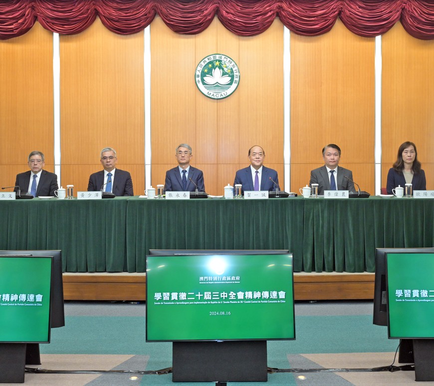 行政長官賀一誠日前在政府總部主持召開澳門特區政府學習貫徹二十屆三中全會精神傳達會,全體主要官員及辦公室主任、約70個部門局級領導全部出席。行政長官高度重視、親自帶領與會各級官員認真學習領會三中全會精神,並作出重要講話。五位司長亦分別作出分享發言。