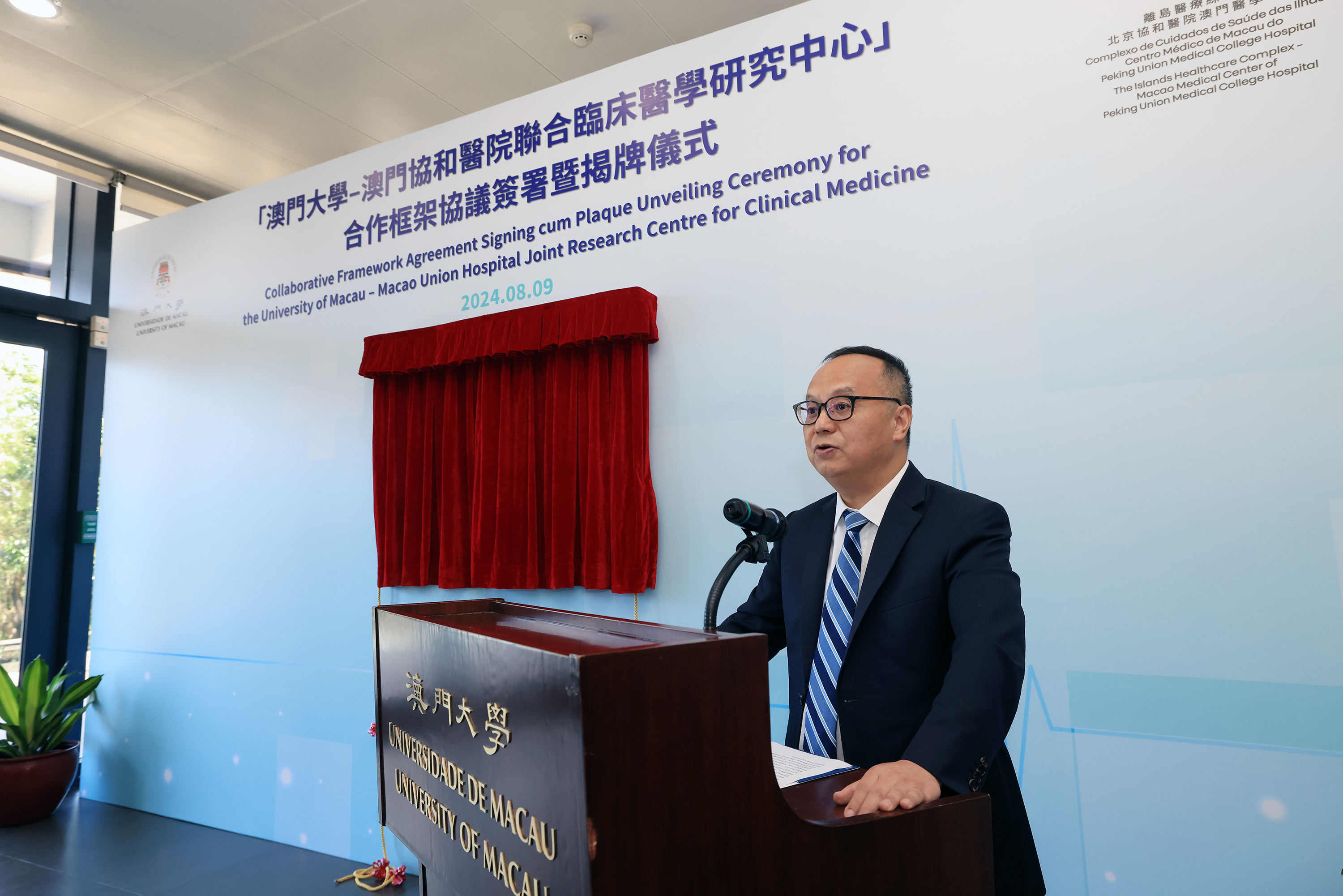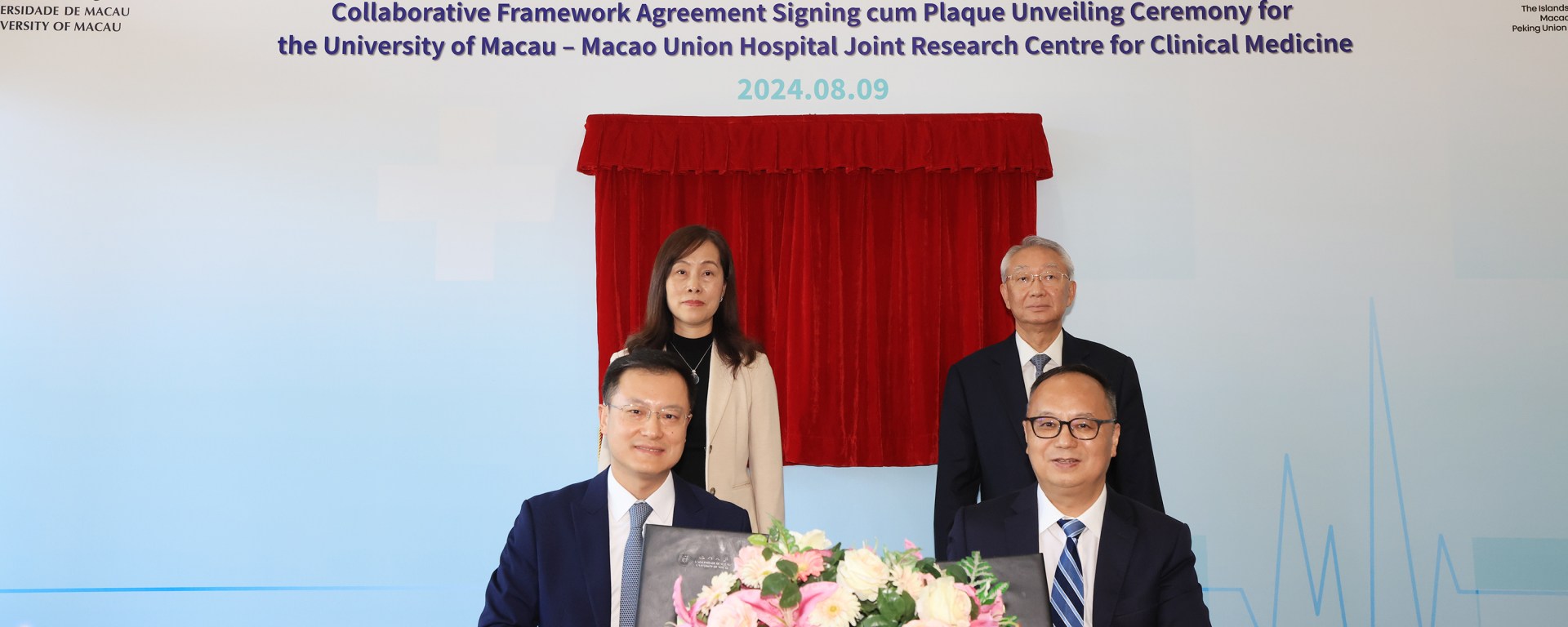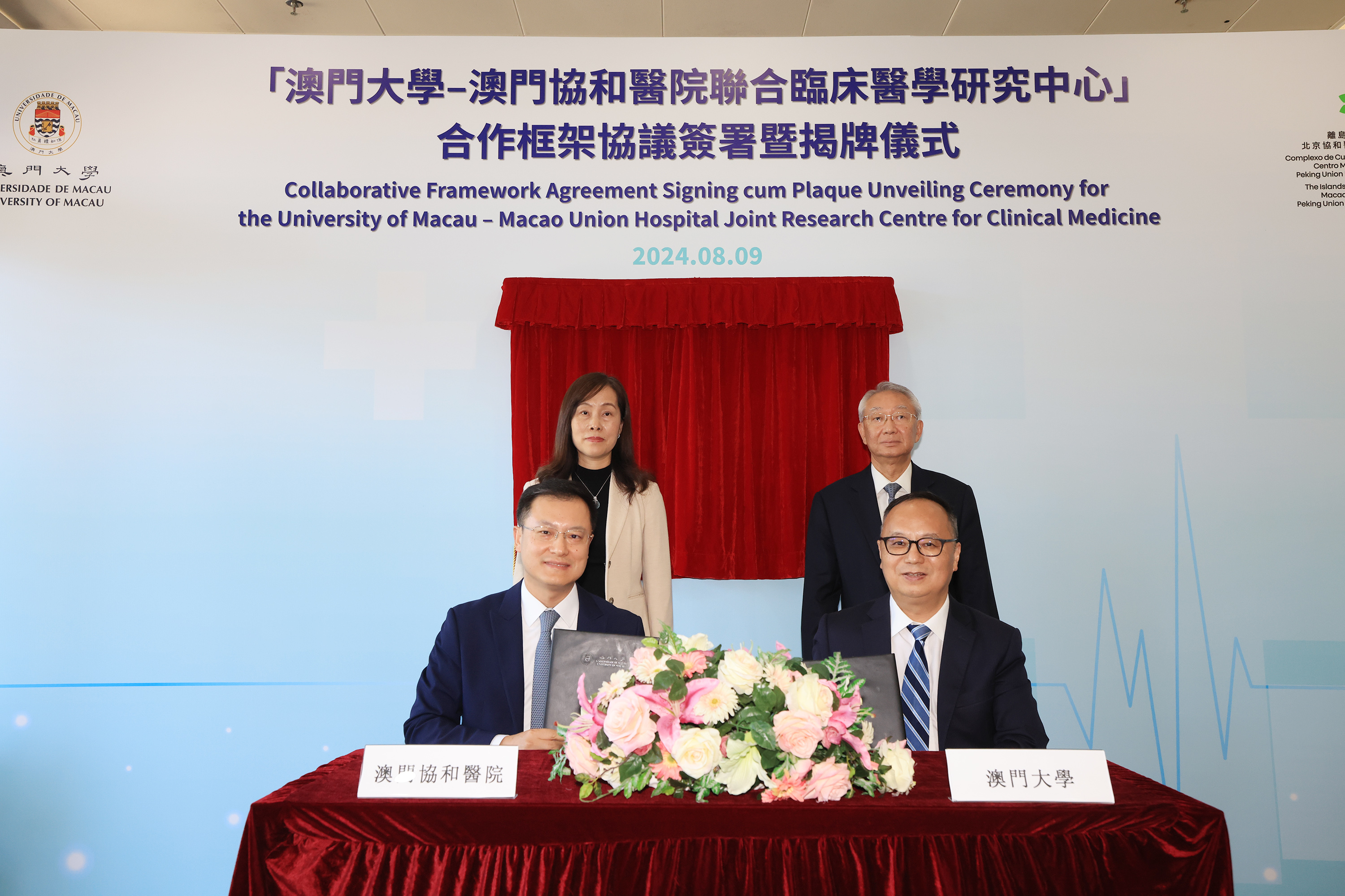 在社會文化司司長歐陽瑜和澳大校董會主席林金城見證下,澳大校長宋永華與澳門協和醫院院長吳文銘簽署合作協議。同場並舉行「澳門大學—澳門協和醫院聯合臨床醫學研究中心」揭牌儀式,由歐陽瑜司長、林金城主席、社會文化司司長辦公室主任何鈺珊、澳門協和醫院策略發展委員會副主席李展潤、宋永華校長及吳文銘院長主禮。