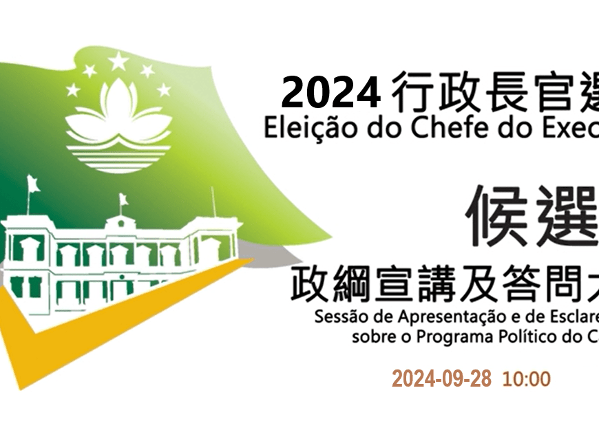 2024行政長官選舉「候選人政綱宣講及答問大會」將於9月28日(周六)早上 10 時至下午 1 時,在中國與葡語國家商貿合作服務平台綜合體會議廳舉行。