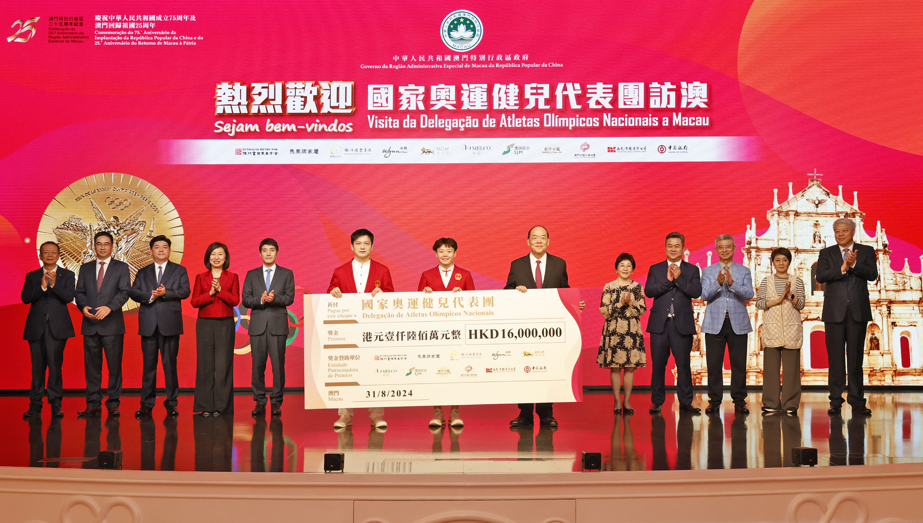 行政長官指出,澳門體育事業近年來取得了長足進步,這離不開國家長期以來的關心和支持。他期待在社會各界的共同努力下,持續推進澳門體育與國家體育的深度融合,藉助國家體育人才和技術的資源優勢,進一步助力澳門體育事業的發展和體育水平的提升。行政長官期望澳門廣大青少年和運動員能夠以國家運動員為榜樣,學習奧運健兒頑強拼搏和愛國精神,將中華體育精神和時代精神發揚光大。