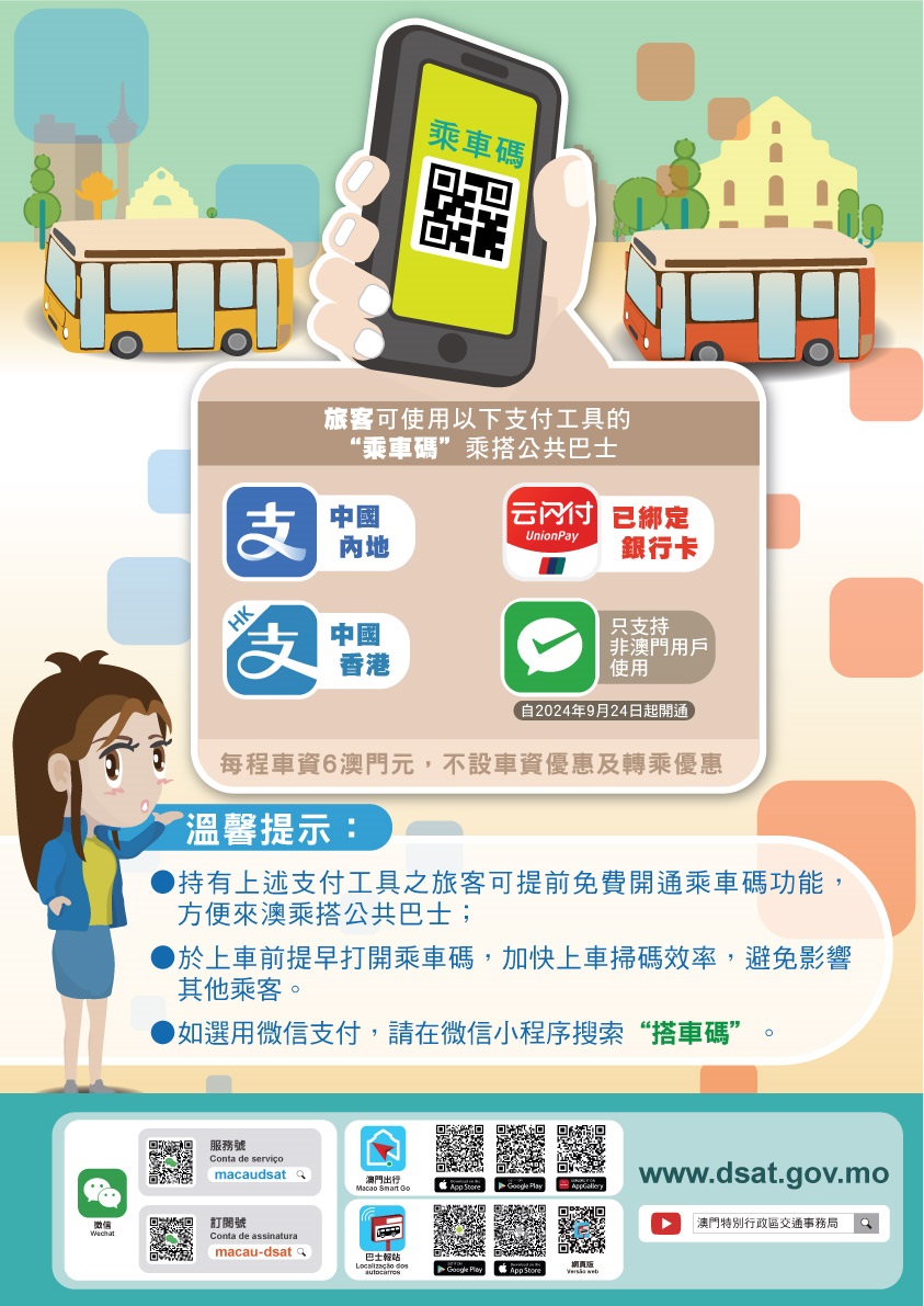 此外,隨著電子支付方式普及使用,交通事務局與金融管理局、巴士公司及支付機構協調,引進更多元的支付方式,以便利旅客使用本澳巴士服務。9月24日(周二)凌晨零時起,微信支付(中國內地及中國香港)兩個版本均可使用乘車碼(微信小程序搜尋「搭車碼」),於本澳公共巴士上掃碼支付車資。使用上述支付方式每程車資為6澳門元,不設車資優惠及轉乘優惠。