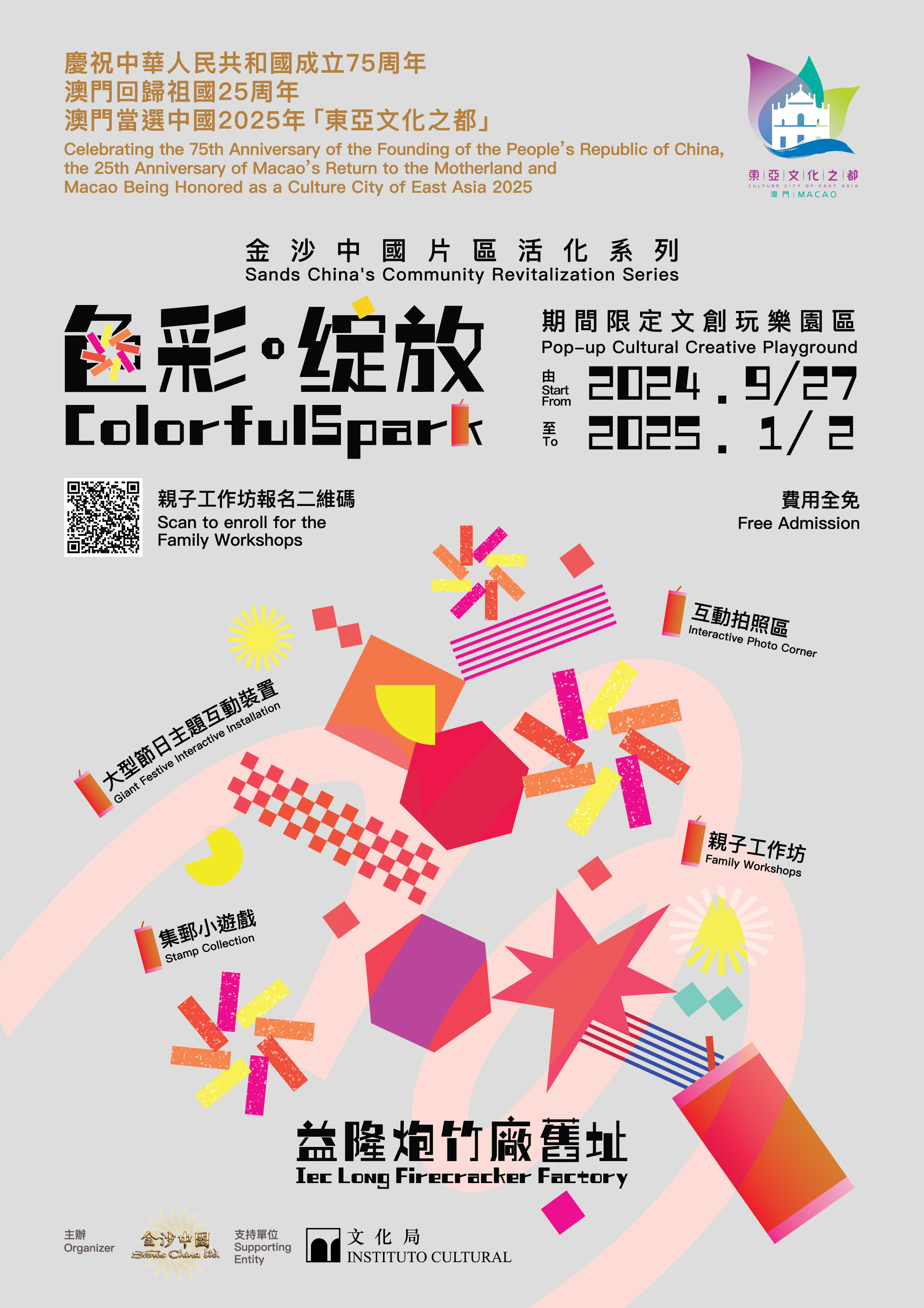 為慶祝中華人民共和國成立75周年以及澳門回歸祖國25周年,金沙中國於9月27日至1月2日在益隆炮竹廠舊址呈獻「色彩.綻放」期間限定文創玩樂園區,以炮竹及花火造形設計的大型互動藝術裝置、寓教於樂的親子工作坊及集郵小遊戲等,在澳門榮獲2025年「東亞文化之都」殊榮之際,為本地居民及遊客呈獻別開生面的遊樂體驗,作為公司片區活化項目的其中一環。