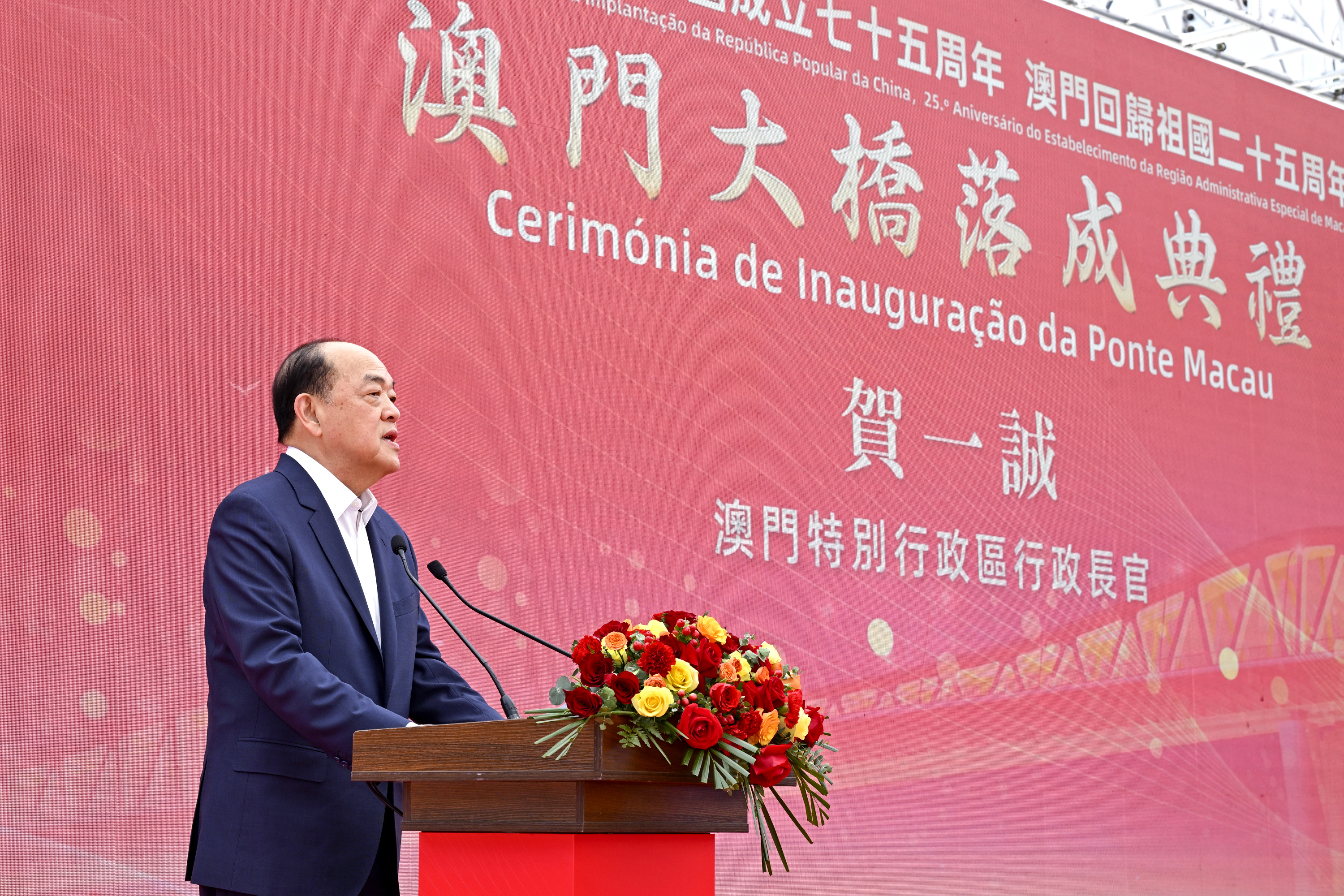 行政長官賀一誠於10月1日出席及主禮澳門大橋落成典禮。他致辭時表示,澳門大橋是毗鄰港珠澳大橋的重要交通基礎設施,不僅完善了澳門整體的交通佈局,亦為居民和旅客創造了更便捷的出行條件,進一步助力澳門建設世界旅遊休閒中心,助力持續增進民生福祉和經濟適度多元發展。