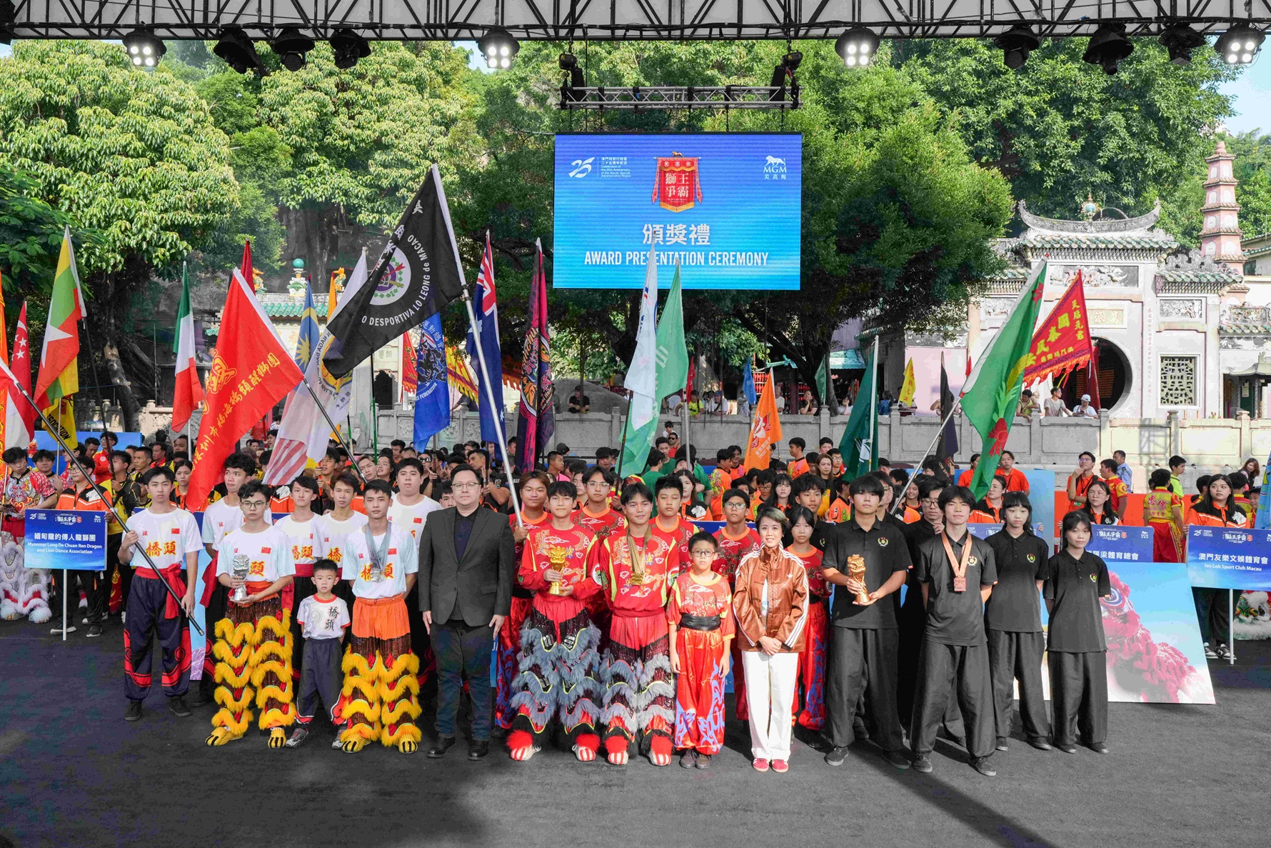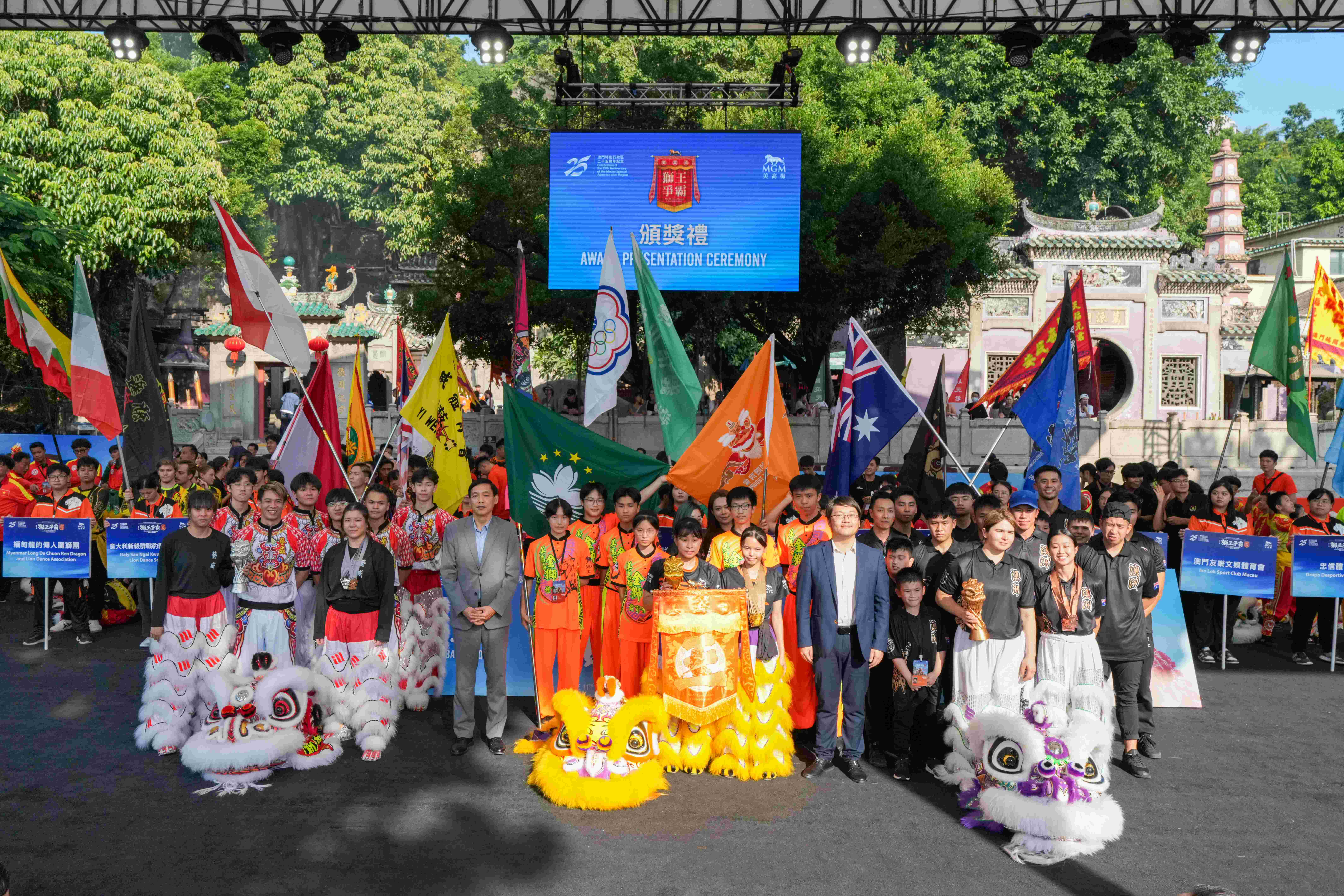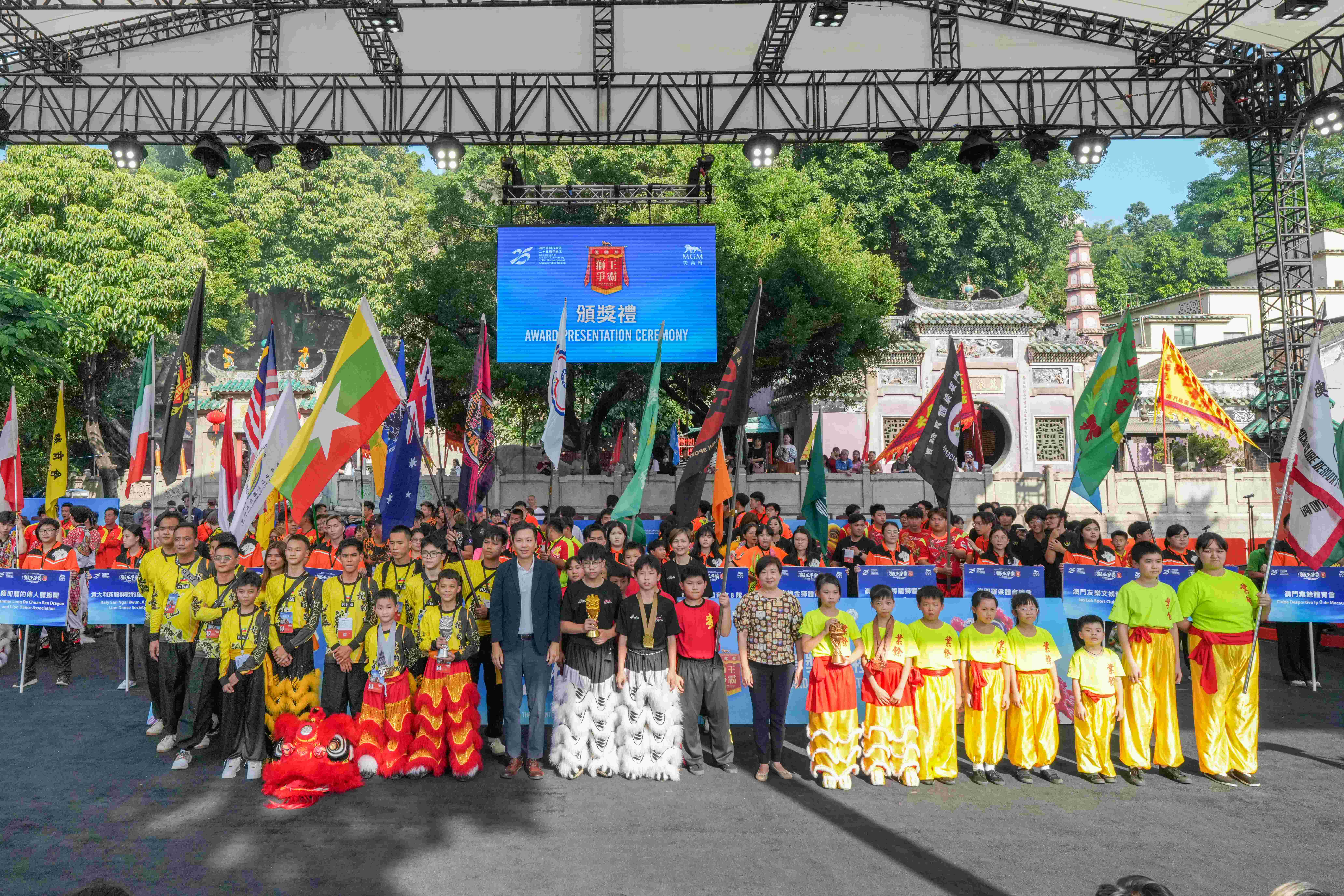 第十一屆「獅王爭霸國際賽 2024 — 美高梅盃」於10月6日圓滿閉幕。本屆賽事的國際認可度進一步提升,有來自13個國家和地區共21支國際南獅勁旅參賽,於世遺景點媽閣廟前地呈獻一場觀賞性極高的世界級體育盛事。一連兩天的輪番激戰,決出南獅規定樁陣自選套路、女子傳統南獅賽、青少年傳統南獅賽和兒童組傳統南獅賽四大項目的最高殊榮。美高梅將全程賽事透過美高梅官方Facebook專頁、世界龍獅網的Facebook專頁和YouTube頻道以及15個國內直播平台同步直播,將這項體藝盛事輻射至全球觀眾,線上線下共錄得近300萬人觀看。