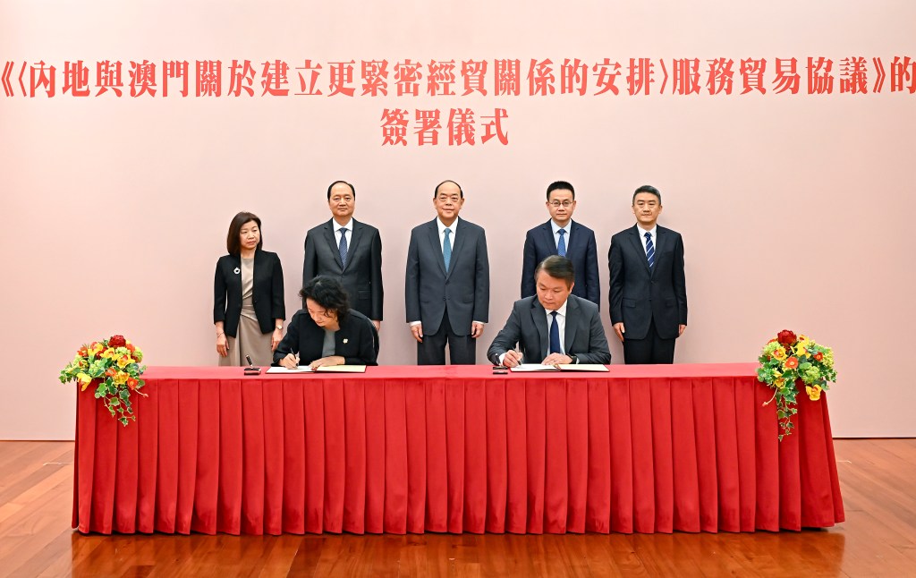 國家商務部國際貿易談判副代表李詠箑(副部長級)與經濟財政司司長李偉農於10月10日在澳簽署《關於修訂〈CEPA服務貿易協議〉的協議二》(《修訂協議二》),行政長官賀一誠及中央人民政府駐澳門特區聯絡辦公室鄭新聰主任見證簽署。《修訂協議二》自簽署日起生效,將於2025年3月1日起正式實施。