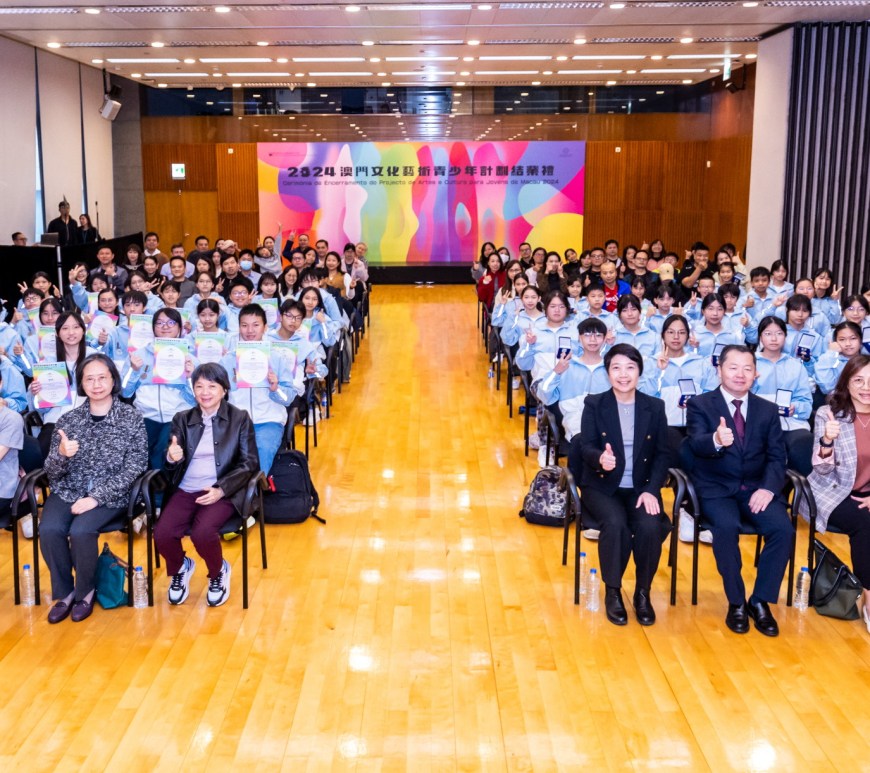 由文化局主辦的2024「澳門文化藝術青少年計劃」於11月23日在澳門文化中心會議室舉行結業禮,文化局局長梁惠敏、中央人民政府駐澳門特別行政區聯絡辦公室宣傳文化部處長王惠杰、教育及青年發展局青年試館主任柯敏茵,文化局澳門博物館館長盧可茵、文化傳播處處長梁靜儀,課程導師李淑儀、胡淑華、簡佩茵、黃碩瑩、葉志堅及孫嘉鳴出席。第二屆學員在一眾嘉賓、導師及家長們見證下獲頒證書及襟章,宣誓成為「文化局學生文化大使」。第一屆學員則獲頒「熱心參與奬」,兩屆共60位學員將繼續並肩參與更多文化藝術學習旅程。