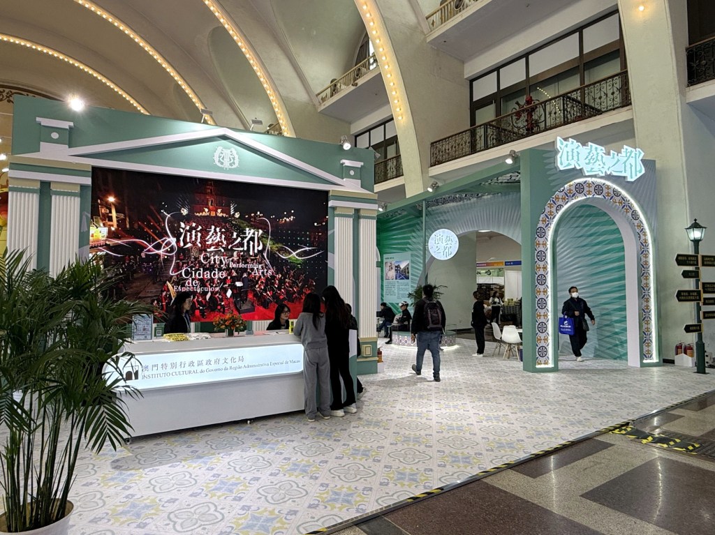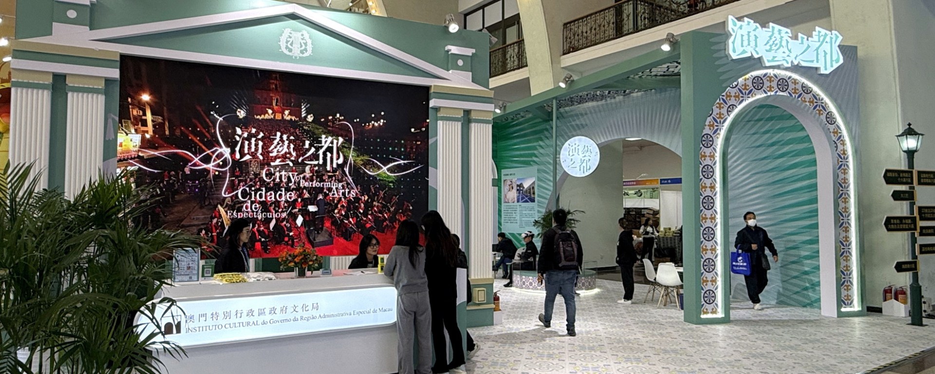 展館以「演藝之都」為主題,融入澳門世遺建築崗頂劇院的設計特色,透過文字、圖像及多媒體呈現方式,突顯澳門文化節慶盛事吸引力,現場設有「時空穿梭‧遊歷三巴」的沉浸式數字影像體驗區,參觀者可穿戴影像虛擬裝置,透過科技置身澳門世遺建築之境,亦可在展館選購澳門藝文節慶特色紀念品。是次參展展示了澳門國際幻彩大巡遊及澳門多個歷史片區的資訊,並藉此推廣崗頂劇院及未來澳門戶外表演區等演藝空間特色。