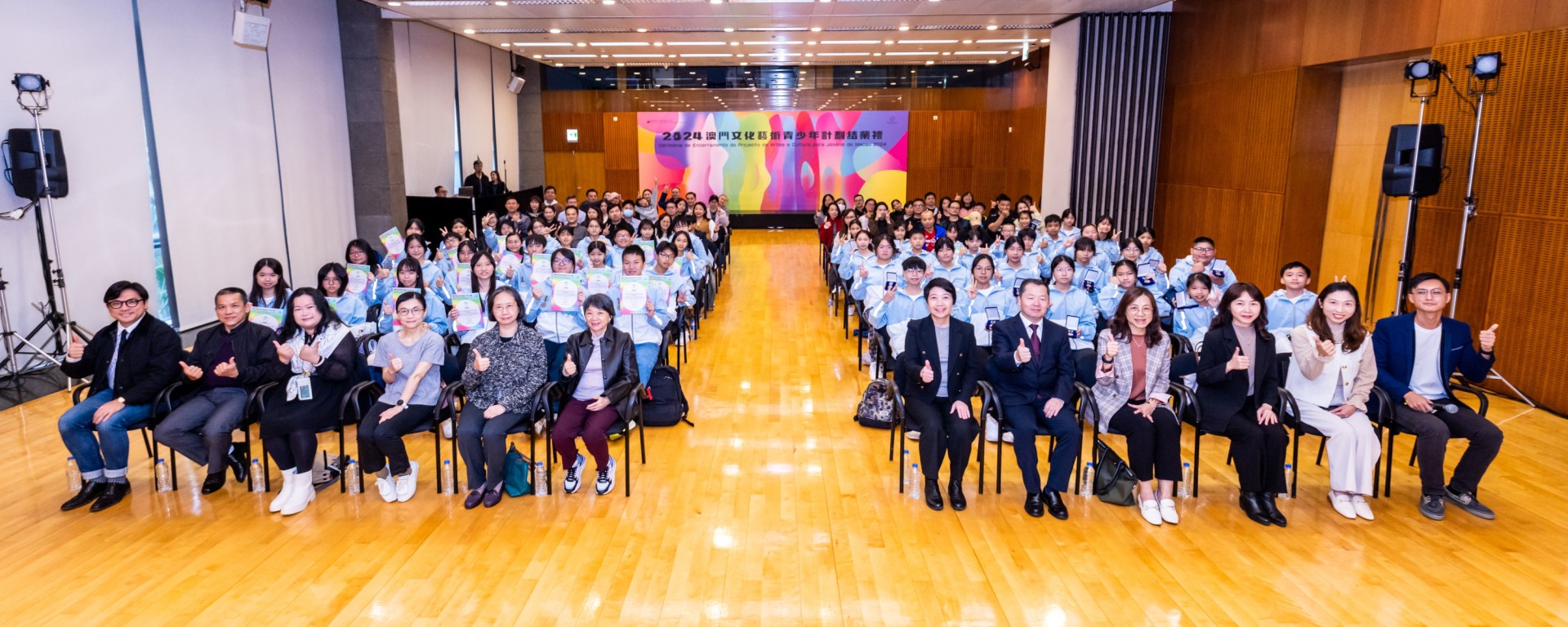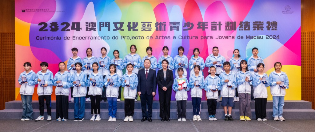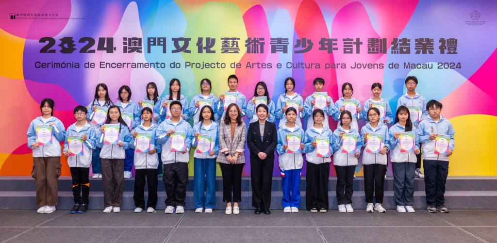 由文化局主辦的2024「澳門文化藝術青少年計劃」於11月23日在澳門文化中心會議室舉行結業禮,文化局局長梁惠敏、中央人民政府駐澳門特別行政區聯絡辦公室宣傳文化部處長王惠杰、教育及青年發展局青年試館主任柯敏茵,文化局澳門博物館館長盧可茵、文化傳播處處長梁靜儀,課程導師李淑儀、胡淑華、簡佩茵、黃碩瑩、葉志堅及孫嘉鳴出席。第二屆學員在一眾嘉賓、導師及家長們見證下獲頒證書及襟章,宣誓成為「文化局學生文化大使」。第一屆學員則獲頒「熱心參與奬」,兩屆共60位學員將繼續並肩參與更多文化藝術學習旅程。