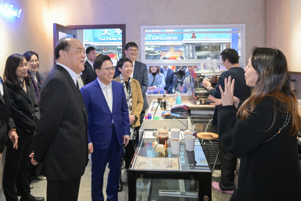 目前,草堆街片區已有「草堆街創業方案大募集」優選企業進駐。行政長官視察期間與多個優選企業商戶交流,瞭解他們的創業理念及店舖營運狀況。有商戶感謝「草堆街片區活化項目」讓他達成創業夢想,幫助中小微企進駐,豐富街區的文旅內涵。行政長官表示,政府十分支持青年人創業,期望片區活化計劃「以大帶小」的營商理念,為社區注入新元素。