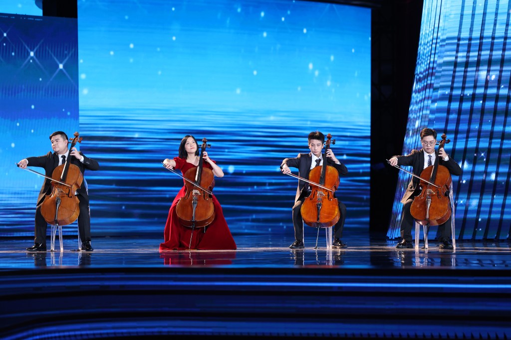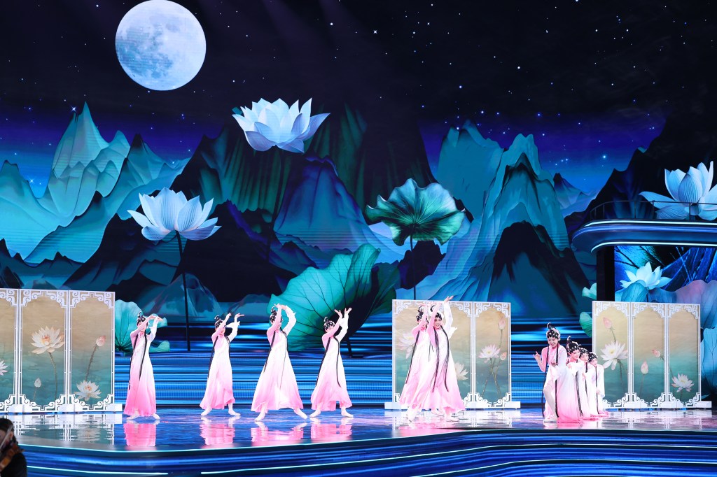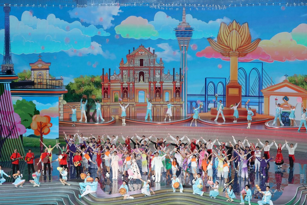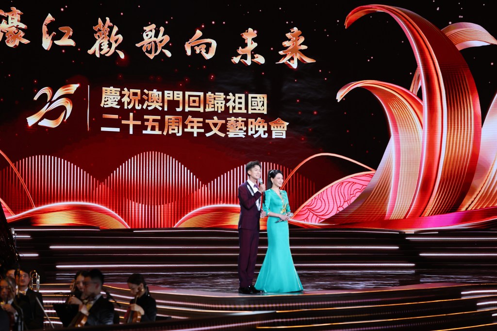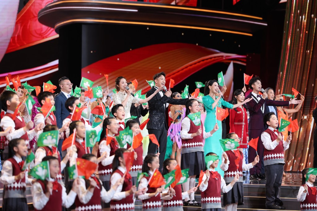 舞台上金蓮花絢麗綻放,《我和我的祖國》、《今夜無眠》樂曲奏響。在《七子之歌》的深情旋律中,老中青三位澳門市民代表抒發了同澳門共成長的獲得感幸福感。青春洋溢的歌舞《澳門你好》烘托出濃烈的節日色彩,器樂表演《鏡海新韵》旋律悠揚,以大寫意描繪粵港澳大灣區藍圖。音樂短劇《“AI”上橫琴》以澳門居民的視角展現橫琴粵澳深度合作區的蓬勃生機,粵歌《蓮.月明升海邊》融合傳統粵劇、歌舞,表達建設和諧幸福澳門的美好期盼,舞蹈《獅躍東方》和歌曲《傳源》彰顯文化傳承發展的自覺自信。情景講述《和祖國一起成長》生動呈現新時代澳門發展的激動人心時刻,合唱《我愛你中國》抒發澳門同胞對祖國母親的真摯熱愛。整台晚會精彩紛呈,高潮迭起,贏得觀眾們陣陣掌聲。