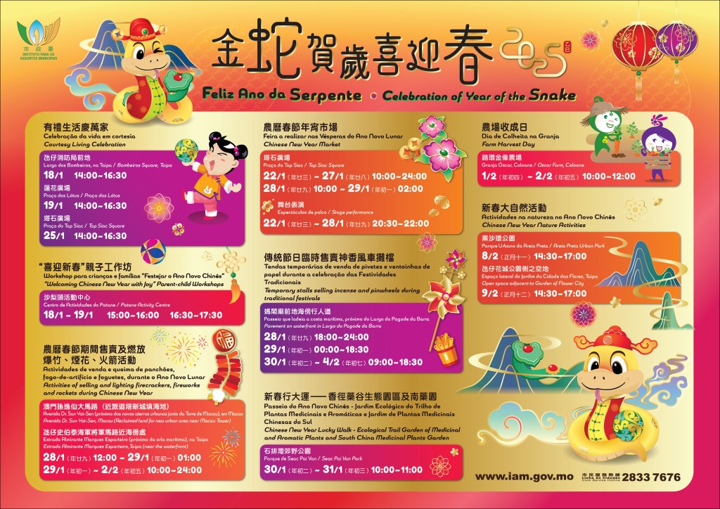 市政署在本澳多個地點舉辦多項傳統應節活動,包括書法名家揮毫及派送揮春、新春行大運親近大自然活動、爆竹燃放區及神香風車攤檔等傳統應節活動,與市民及遊客一起迎新歲、賀新禧。同時,市政署呼籲活動參加者時刻保持個人及環境衛生,留意現場人潮情況,遵從現場工作人員指示遵守秩序。