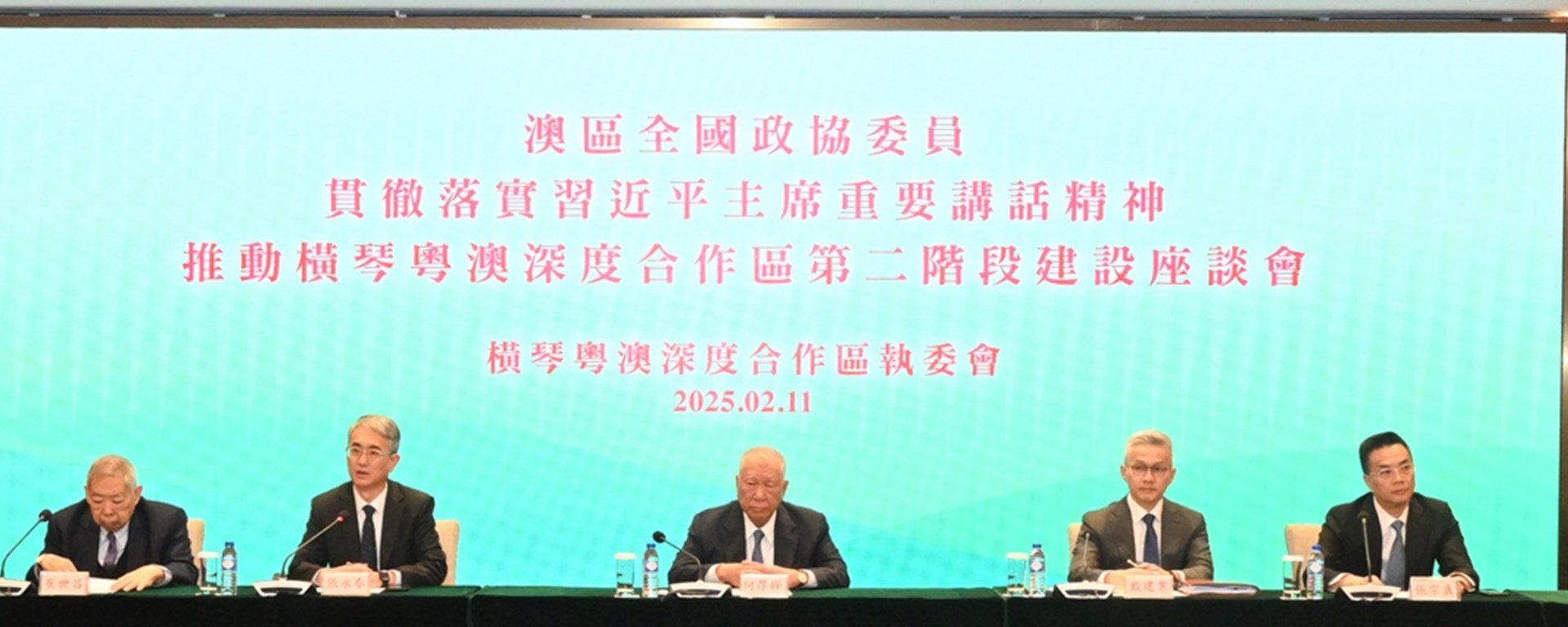 橫琴粵澳深度合作區執委會日前在澳分別與澳區全國人大代表、澳區全國政協委員舉行座談會,就貫徹落實習近平主席重要講話精神、推動橫琴合作區第二階段建設聽取意見建議。全國政協副主席何厚鏵,全國人大常委高開賢,澳區全國人大代表劉藝良,執委會主任張永春、副主任戴建業、聶新平等出席座談會。
