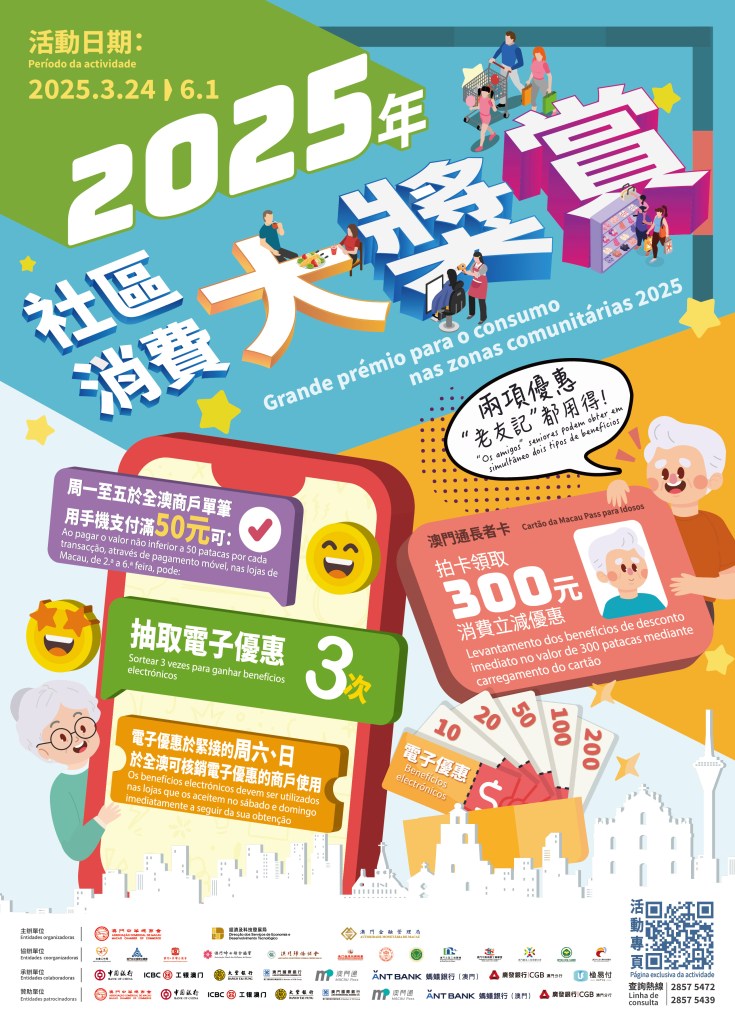 由特區政府聯同商會於3月24日至6月1日合辦為期10周的「2025年社區消費大獎賞」大型促消費活動已於日前啟動。活動期間,市民可透過移動支付,在周一至周五單筆消費滿50元,即可抽取電子優惠3次(每個實名認證錢包帳戶每周抽取優惠上限3次),抽取優惠機會每周六凌晨清零。另外,長者更可同時領取消費立減優惠,而截至4月5日下午5時已有逾8.4萬名長者完成拍卡領取優惠。