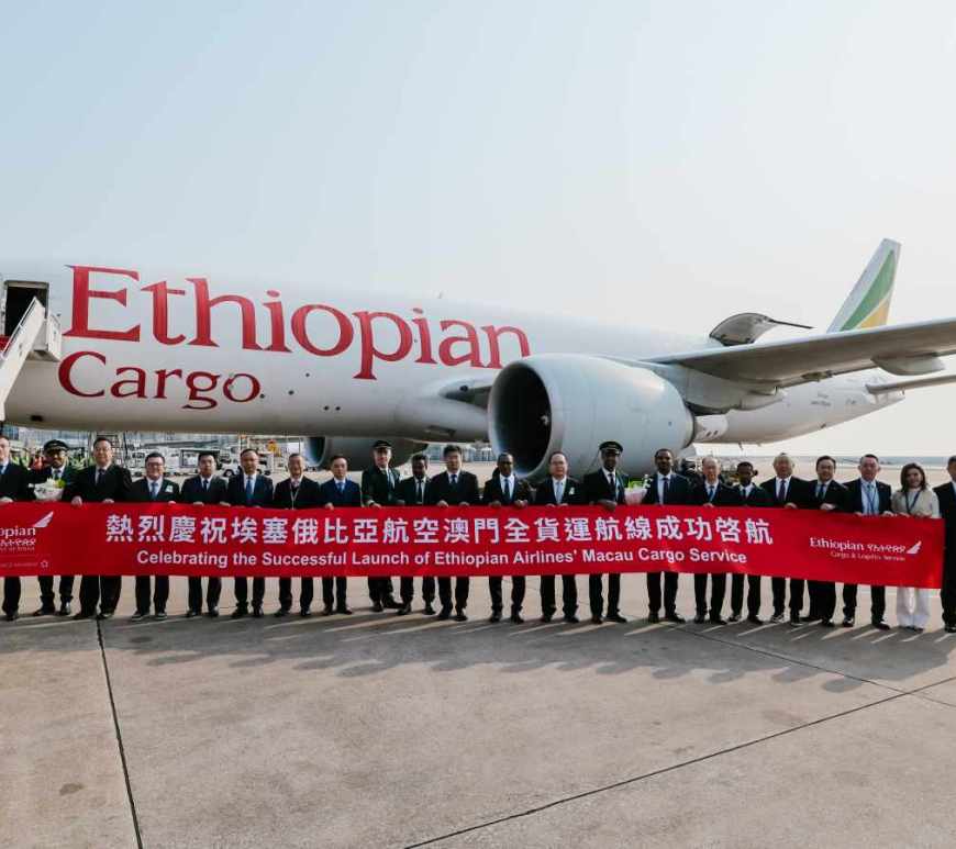 澳門國際機場專營股份有限公司(CAM)執行委員會主席陳穎雄先生及執行董事李時泰先生出席埃塞俄比亞航空的澳門至馬德里全貨機航線首航儀式。埃塞俄比亞航空(Ethiopian Airlines)自2025年4月3日起正式開通澳門至西班牙馬德里的全貨機航線,該航線由波音777F全貨機執飛,每週運營兩班。新航線的開通將進一步強化亞洲與歐洲之間的航空貨運網路,為粵港澳大灣區產品出口提供更高效的物流支援,有助提升灣區的物流競爭力。埃塞俄比亞航空的加入,使澳門國際機場全貨機除亞洲、中東及美洲市場外,亦與歐洲建立聯繫。