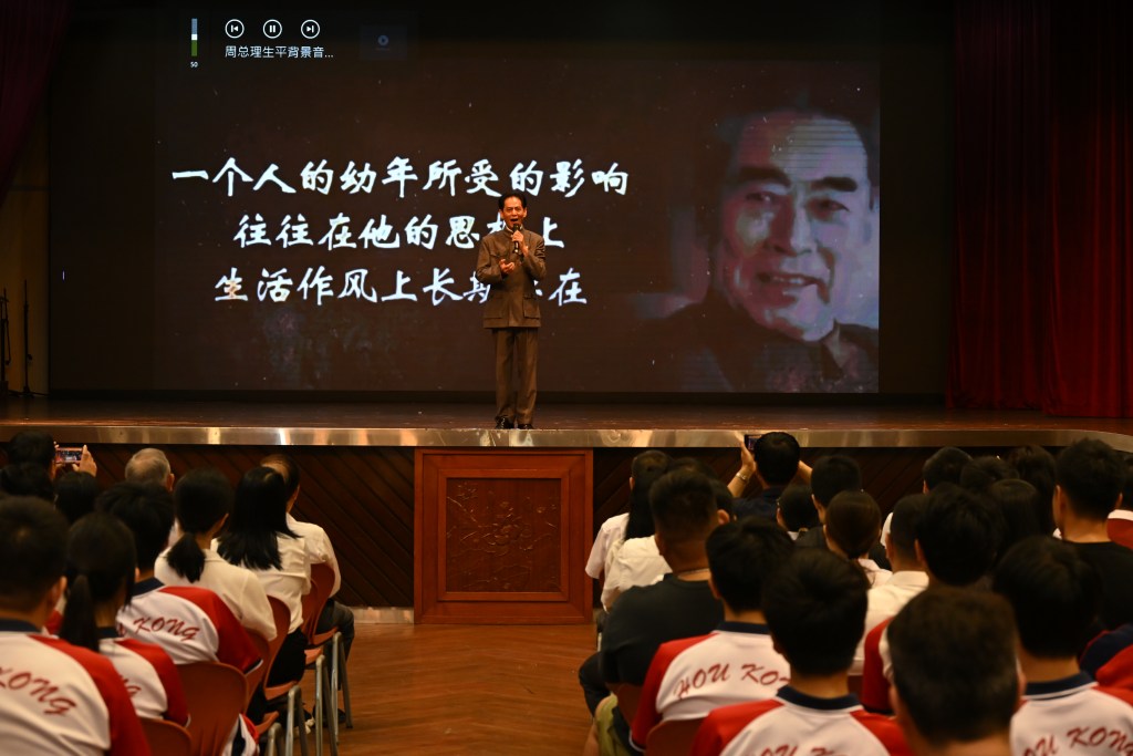 濠江中學校本部五月十九日舉行《為中華之崛起而讀書——周恩來故事分享會》主題周會,約二千名教師與學參與。