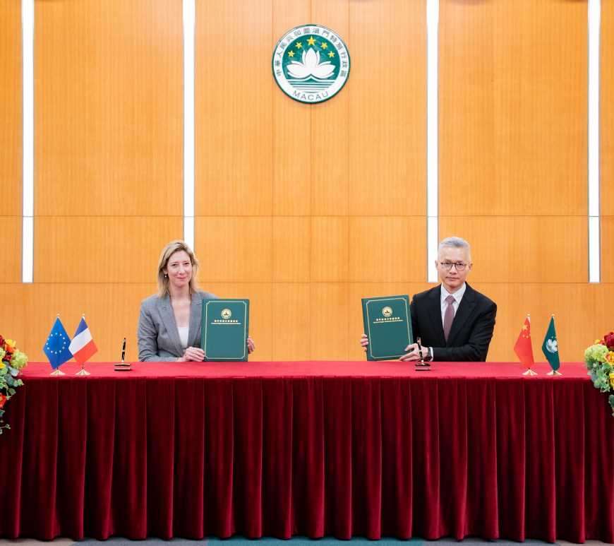經濟財政司司長戴建業代表特區政府與法國政府代表法國駐香港總領事館總領事杜麗緹於5月8日在澳門簽署了《中華人民共和國澳門特別行政區政府和法蘭西共和國政府有關執行科研合作計劃的協議》。該協議旨在加強雙方在科研領域的交流與合作,促進科技創新和人才培養,是澳門著力打造更高水平對外開放平台的重要進展。外交公署副特派員孫向陽出席,以及高校、科技企業、法國及歐洲商會等機構代表近40人出席簽署儀式。