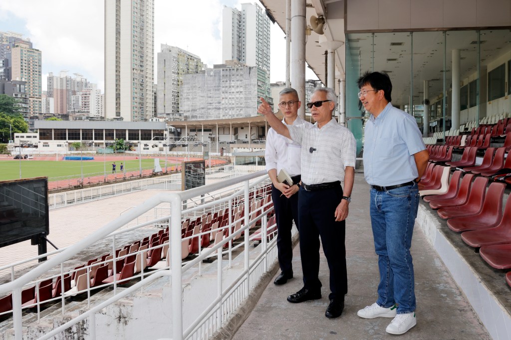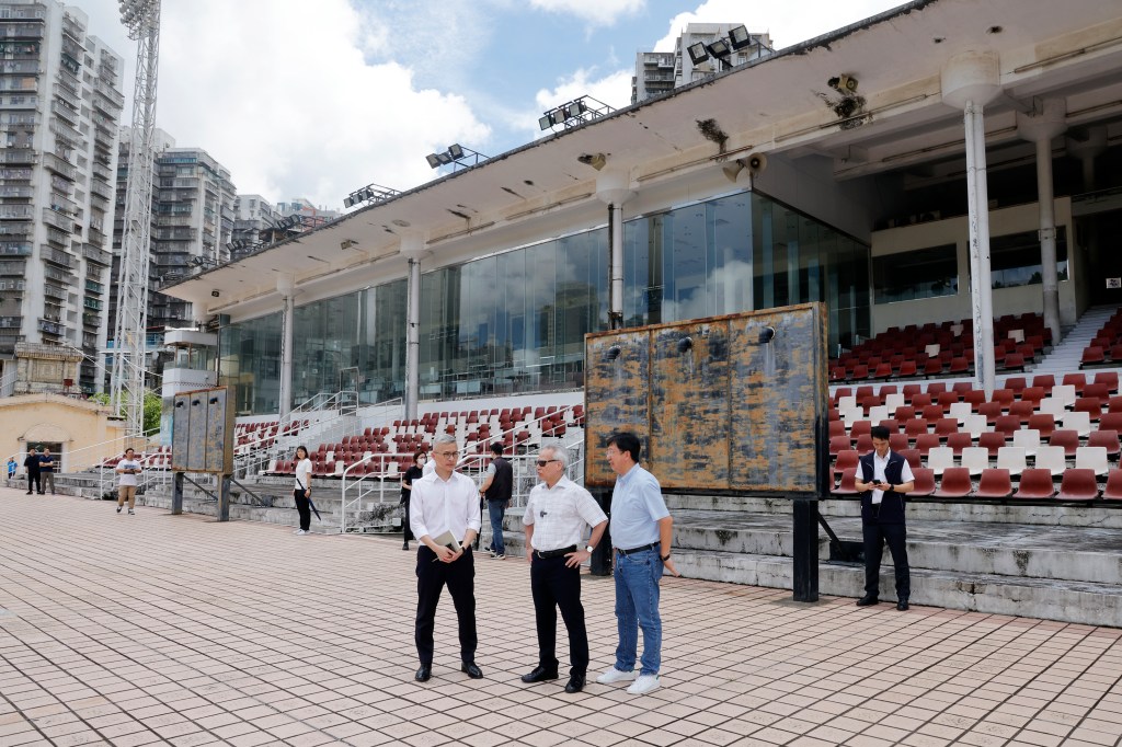 岑浩輝最後視察計劃興建市民運動公園的原逸園狗場地段,實地了解及聽取運輸工務司司長譚偉文介紹相關的重整規劃和工作進度。